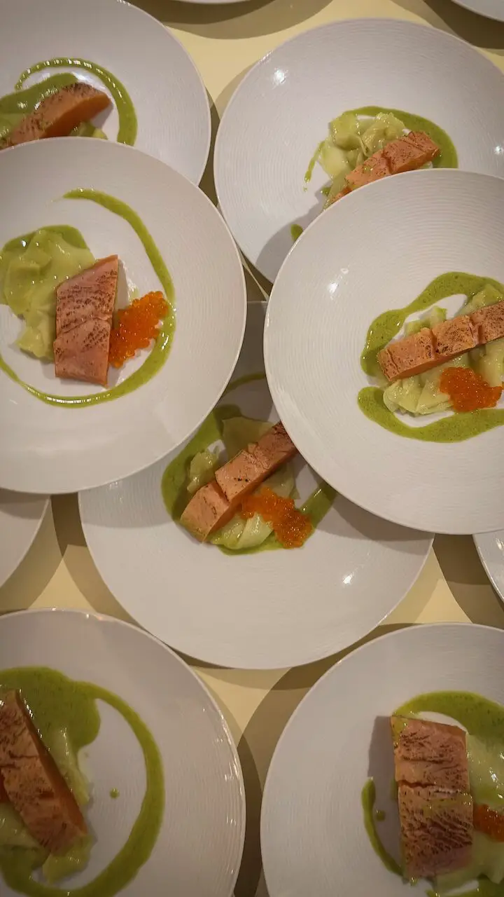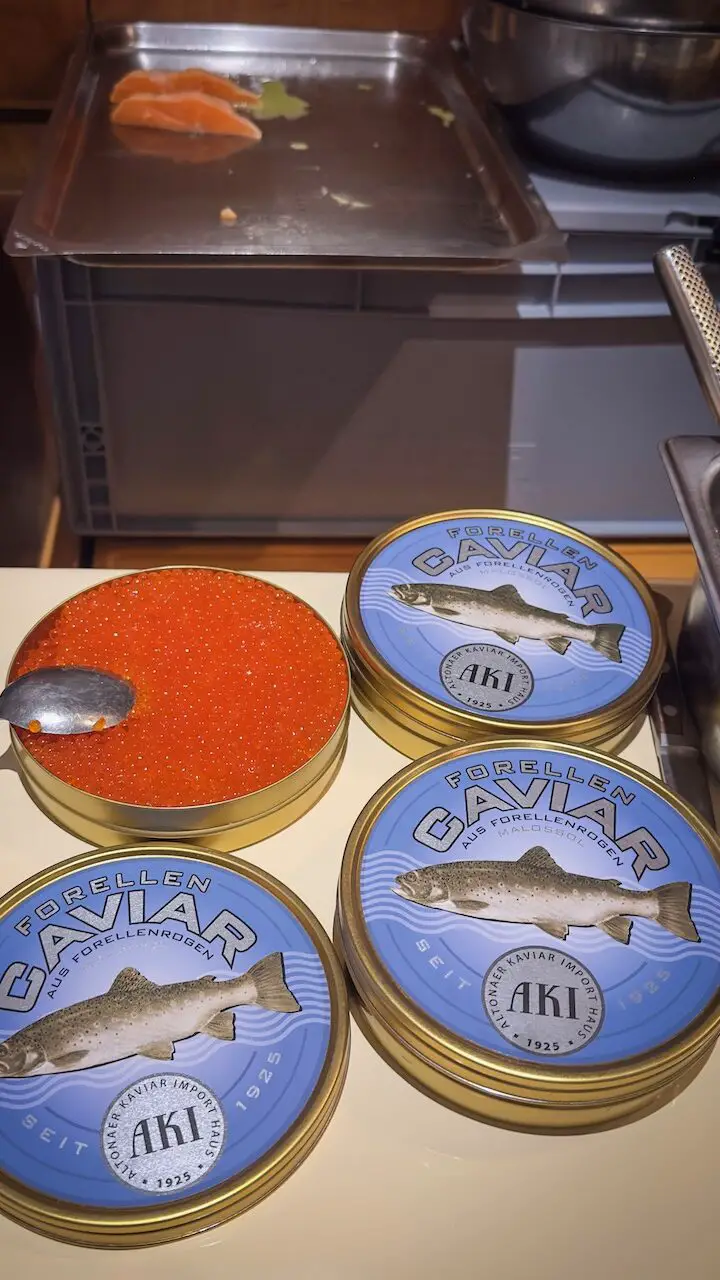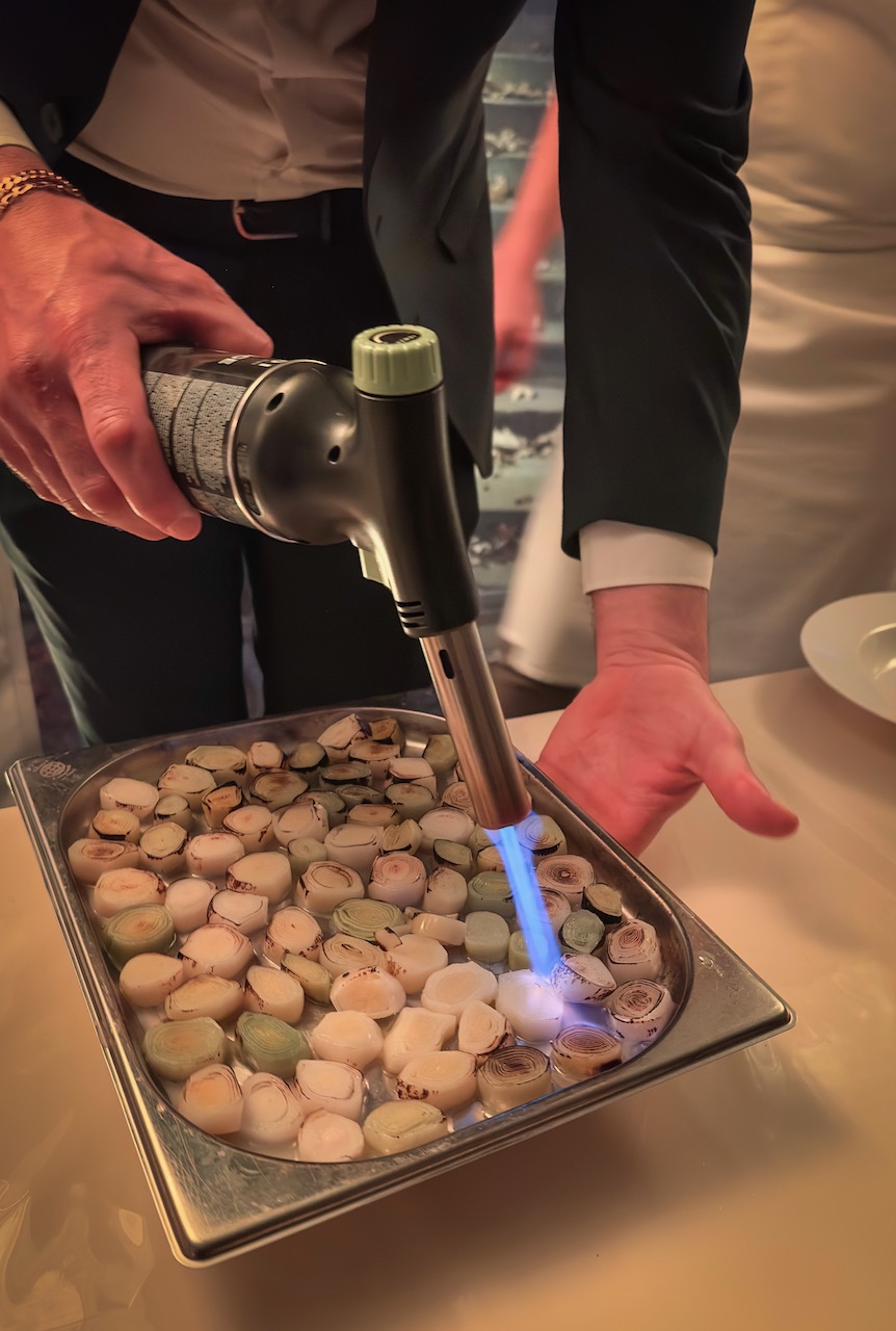 Ein kulinarischer Gruß aus unseren Nachbarländern, der uns sofort begeistert hat, kam von Sternekoch Bas Diepenbroek* vom Kasteel Engelenburg im niederländischen Brummen. Er präsentierte uns eine Forelle mit Sanddorn, Kaviar und Orangenblüte. Die feine Säure des Sanddorns kitzelte die Frische der Forelle wach, während der Kaviar für edle, salzige Akzente sorgte und die Orangenblüte dem Ganzen eine Zitrusnote verlieh. Bas versteht es meisterhaft, die klassische niederländische Küche modern und federleicht zu interpretieren.