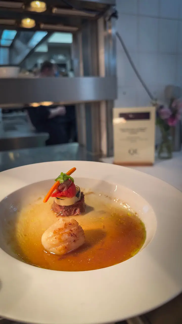 Ein absolutes Highlight, das mich komplett aus der Reserve gelockt hat, war die Kreation von Sternekoch Ralph Hermans* vom Restaurant „La Source“ im belgischen Lanaken. Seine Kombination aus Jakobsmuschel mit Ochsenschwanz, Lauch und Sardine war ein Paradebeispiel für das, was man „Surf & Turf“ auf Sterneniveau nennt. Die butterzarte, süßliche Meeresfrucht traf auf die kräftige Würze des geschmorten Ochsenschwanzes, während die Sardine für einen frechen, salzigen Akzent sorgte. Es ist genau dieses Spiel mit extremen Geschmackskontrasten, das Ralph Hermans so meisterhaft beherrscht!