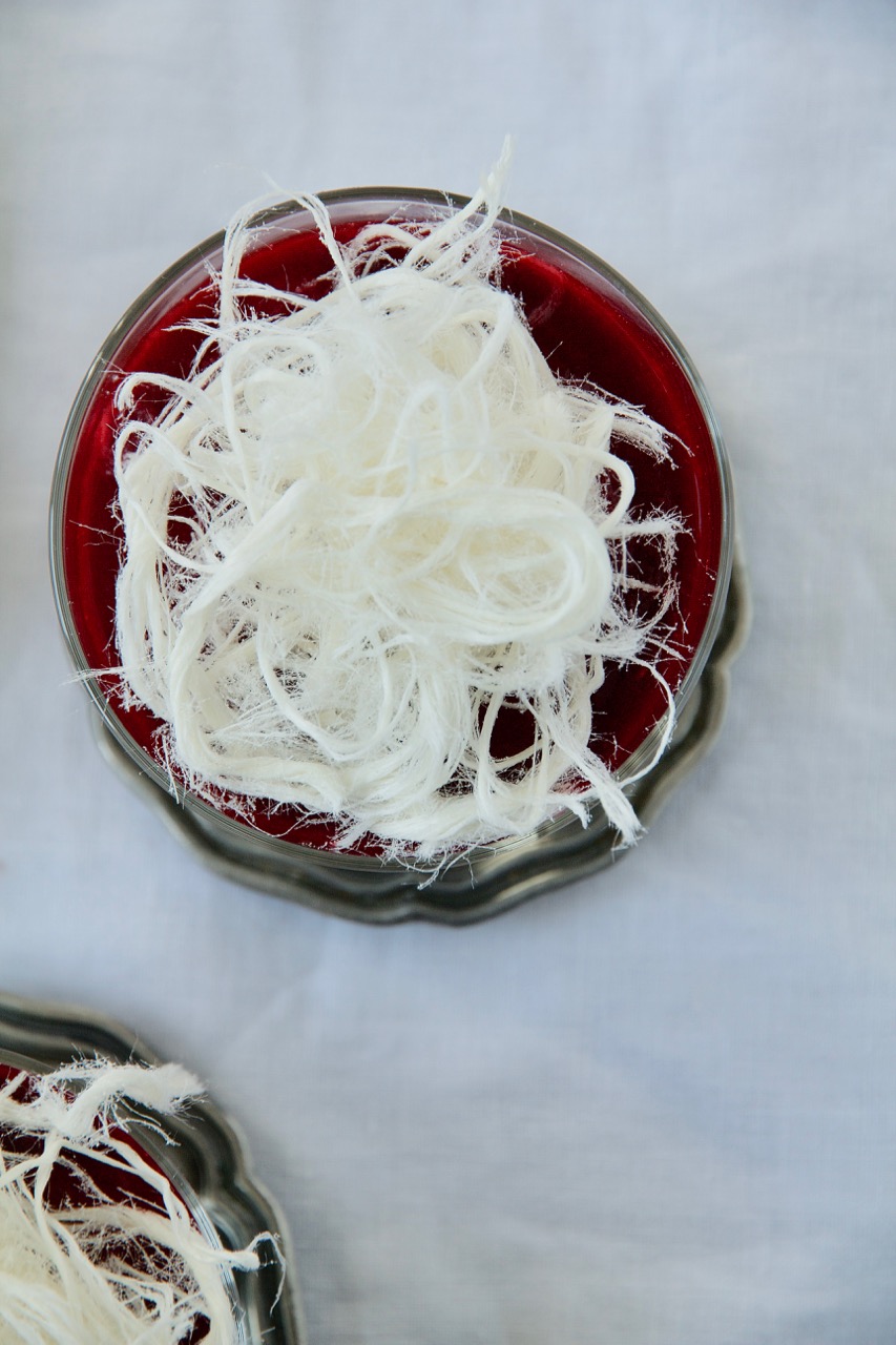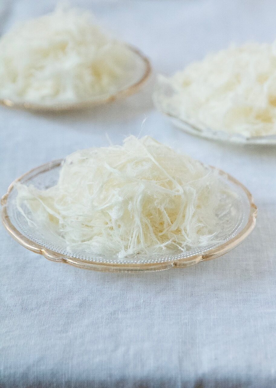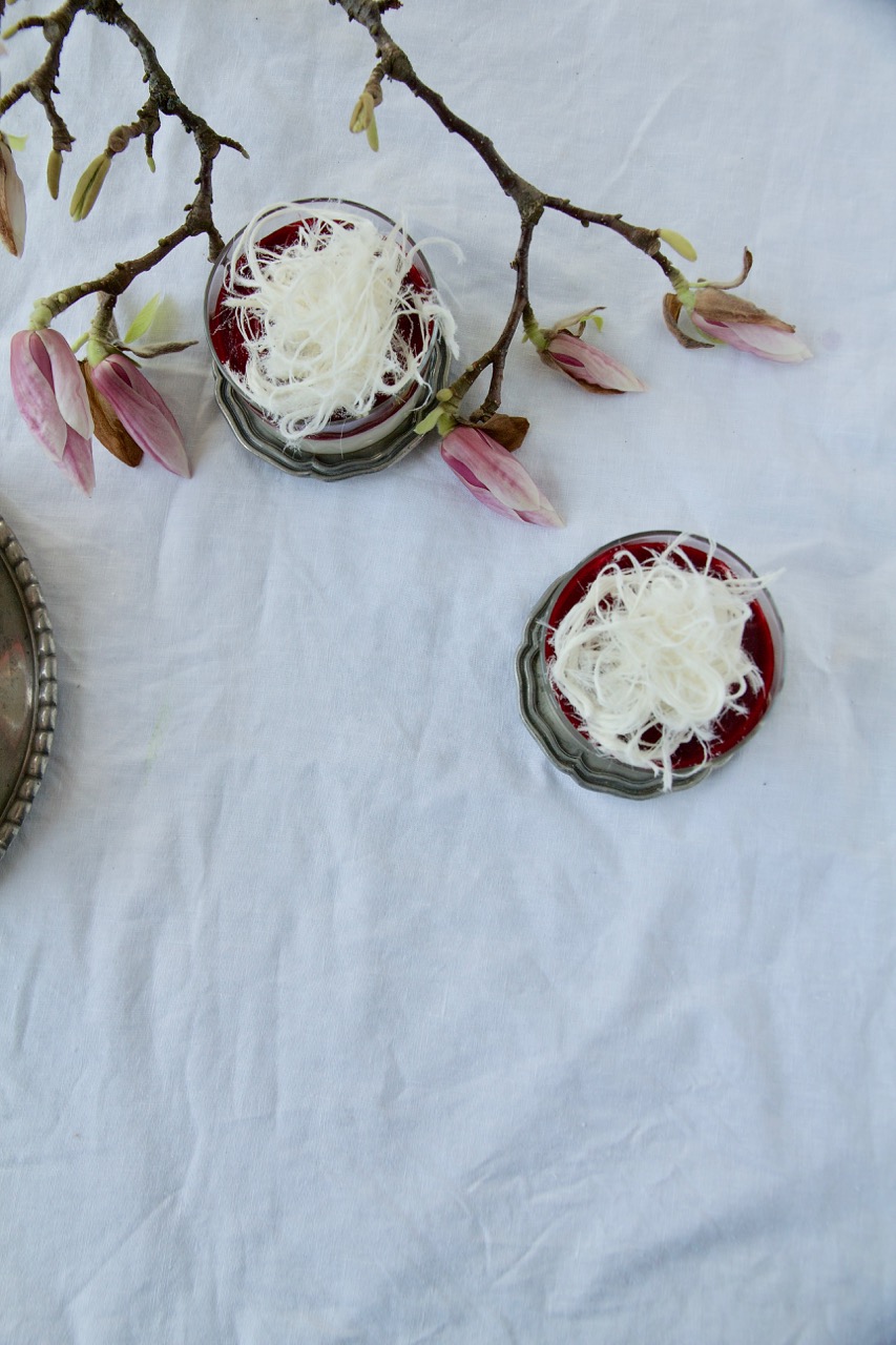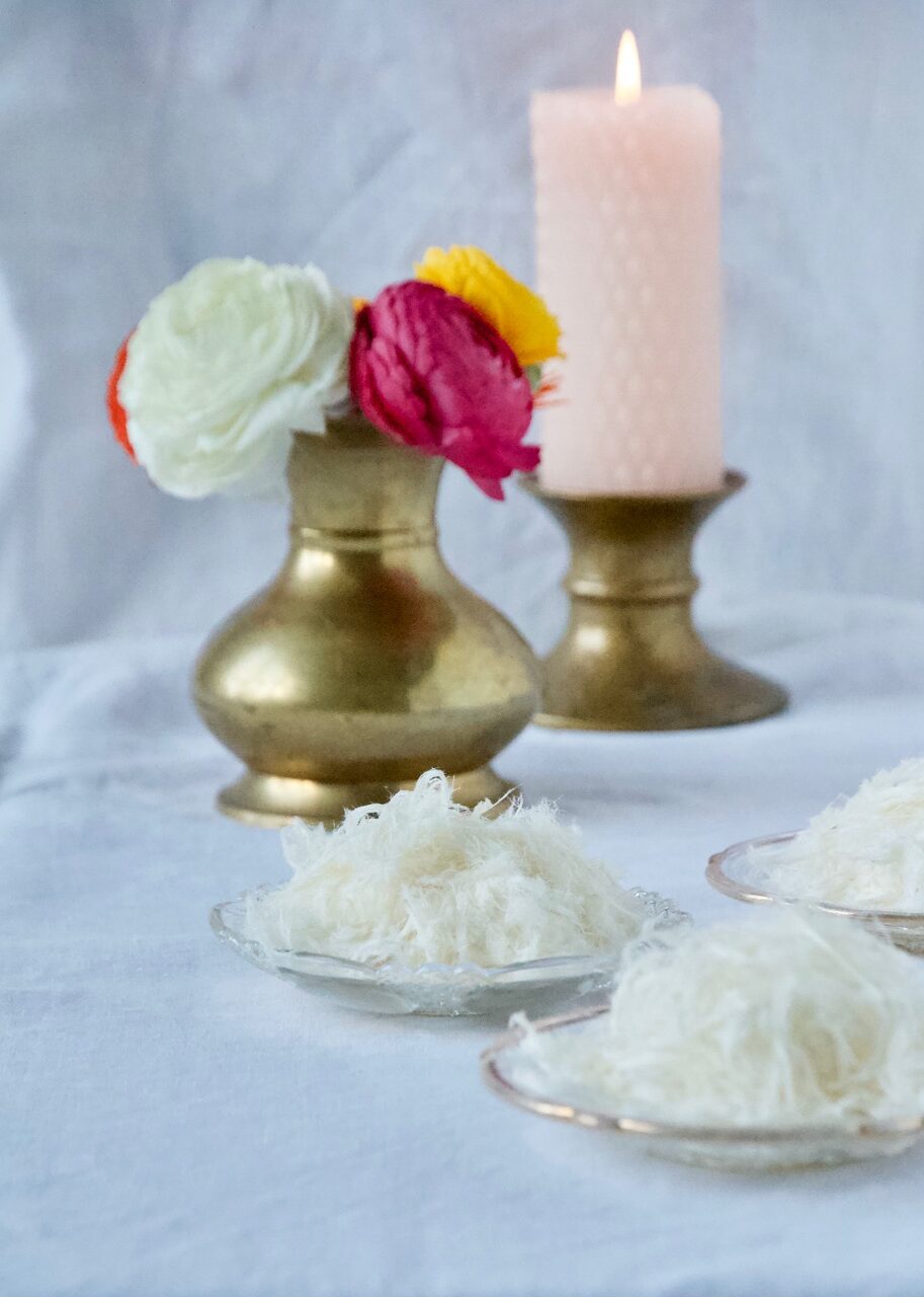 Jeder kennt Zuckerwatte vom Jahrmarkt, aber Pashmak ist ein Meilenweiter Unterschied zur Zuckerwatte. Sie ist ganz zart, nussig, süß und besteht aus hauchfeinen, luftigen Zuckerfäden ohne das sie an den Fingern kleben bleibt. Genauso wie Zuckerwatte schmilzt Pashmak sofort auf der Zunge oder bei Berührung mit Flüssigkeit. Deshalb kommt Pashmak kurz bevor du Fereni servieren möchtest auf das Schichtdessert. „Pashm“ bedeutet auf persisch Wolle und „Ak“ ähnlich wie, somit bedeutet Pashmak übersetzt ähnlich wie Wolle. Ich würde es eher so übersetzen, zart wie Cashmere Wolle.