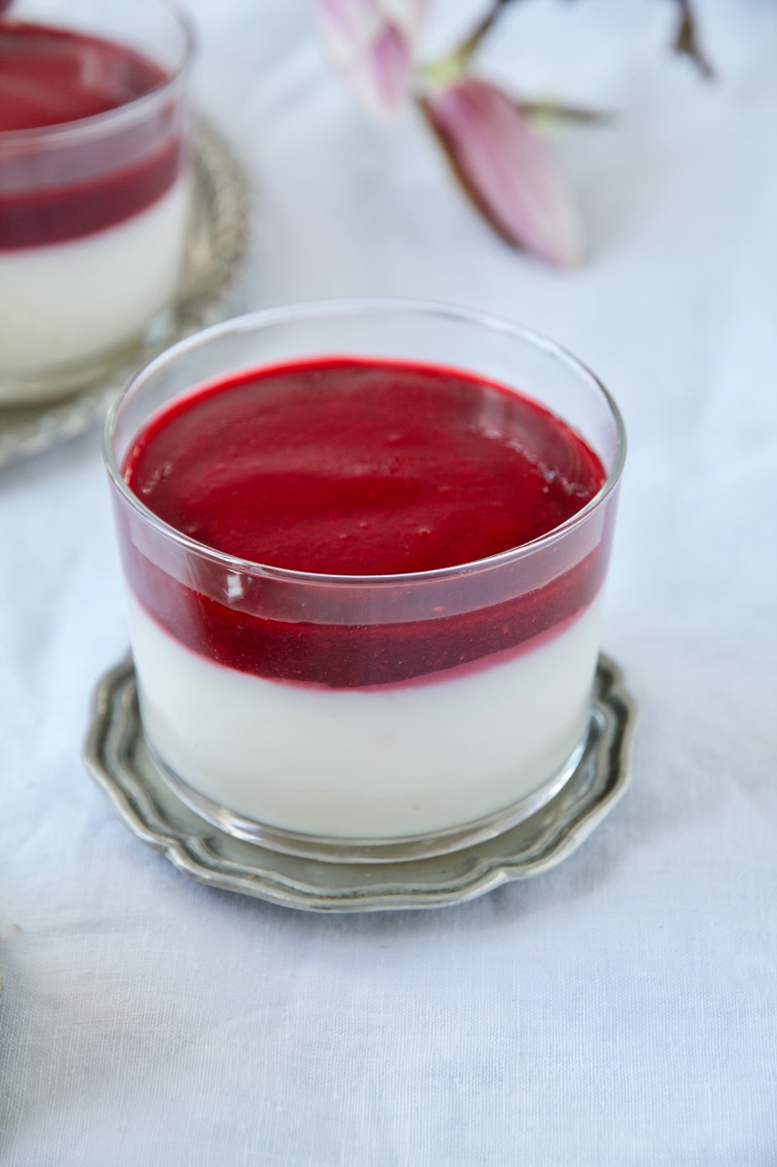 Himbeerpüree auf die gekühlte Reiscreme geben und nochmals kühl stellen