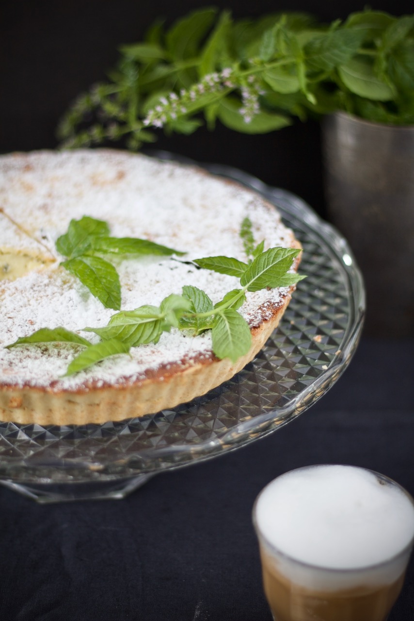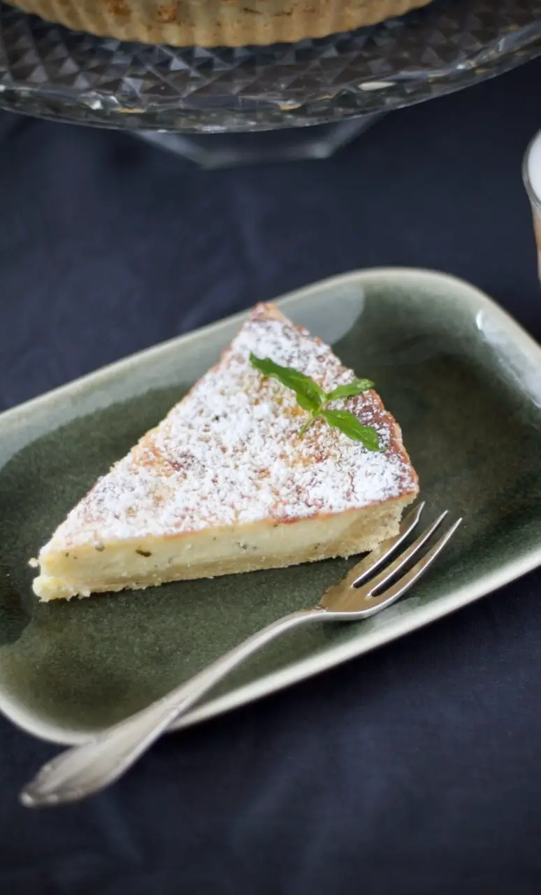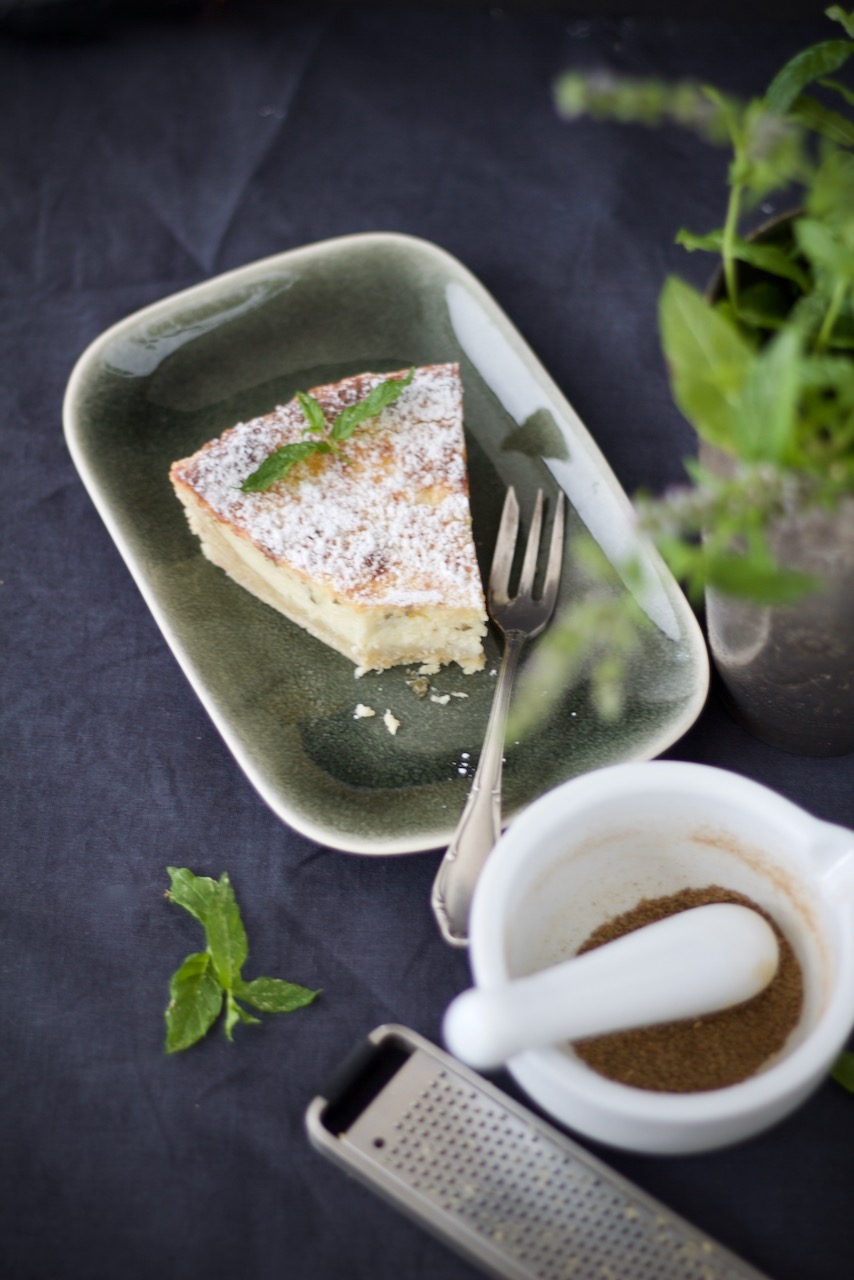 Flaó über Nacht in den Kühlschrank geben, am nächsten Tag mit Puderzucker bestäuben und mit Pfefferminzblätter dekorieren.