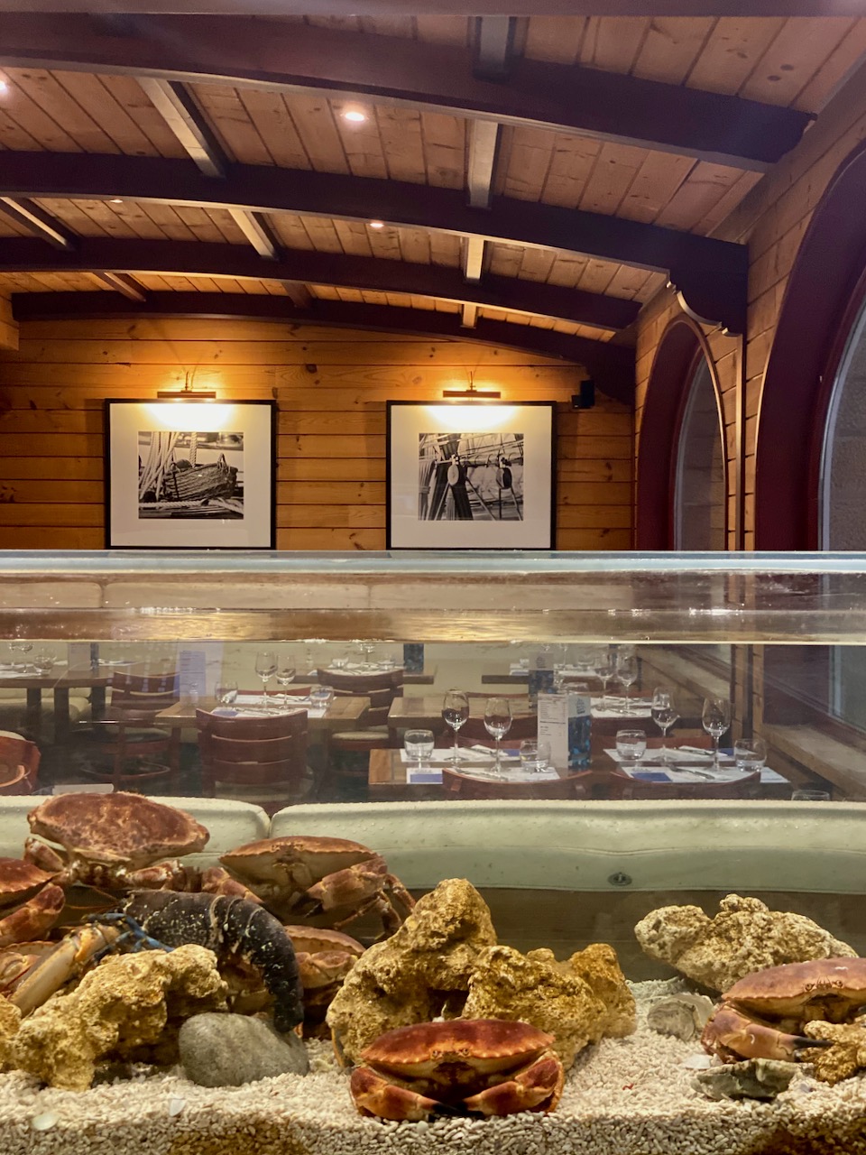 Das charmante Café du Port ist eigentlich ein Restaurant, hat eine herrliche Lage am idyllischen Hafen und bietet hochwertige bretonische Gerichte, ein place to be. Direkt am Eingang befindet sich ein Aquarium gefüllt mit fangfrischem Hummer, Taschenkrebse und andere Meeresfrüchte aus der Küstenfischerei. Die Decken und die Wände sind mit Tropenholz verkleidet und erinnern mit den großen Fenstern und die Handläufer an das innere eines Schiffes. Wir beginnen den Abend mit einem Gläschen Kir Breton, ein Aperitif aus Crème de Cassis (Johannisbeerlikör) und gekühltem trockenen bretonischen Cidre, rotleuchtend im Glas und einfach nur köstlich! Cidre ist das Pendant zu unserem hessischen Apfelwein und das Have To Drink in der Bretagne. Beim „Fouesnant von Manoir du Kinkiz“ handelt es sich um einen der besten Cidre aus ganz Bretagne.