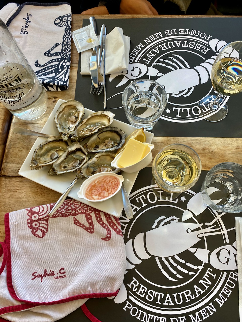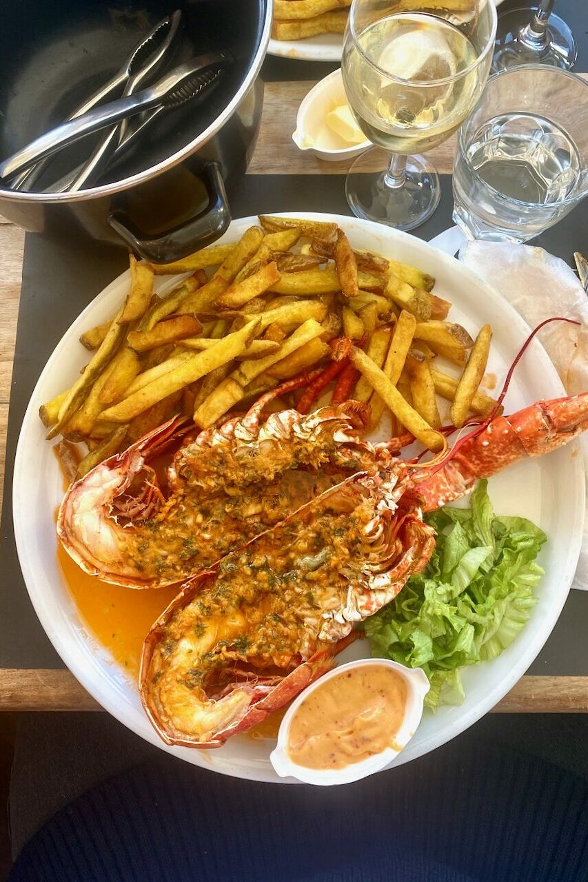 Bekanntlicherweise macht die Seeluft Appetit! Für den kleinen Hummer zwischendurch ist zum Glück das Hippe An Atoll nicht mehr weit. Das überaus freundliche Team erwartet uns zum Rendez-vous mit dem Homard. Der Tisch ist schon wunderschön für uns eingedeckt, samt Lätzchen, Zange und Besteck für den Hummer. Wir starten zunächst wie sollte es auch anders sein, mit frischen Austern. Zum probieren serviert uns Nicola, der seit 17 Jahren das An Atoll betreibt noch köstliche Kabeljau Fischballen. Bevor wir den frischen Hummer geniessen dürfen, bekommen wir die Schönheit noch lebendig von Nicola präsentiert. Der Hummer hat einen wunderschönen schwarzen Panzer mit leicht bläulichem Schimmer.