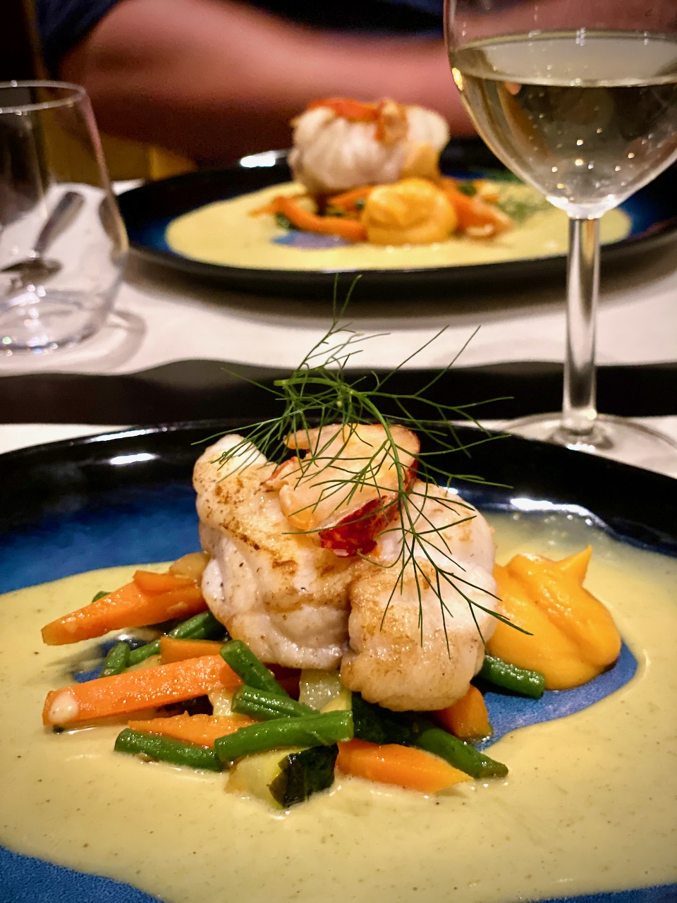 An diesem Abend erleben wir einen kulinarischen Segeltörn und starten mit dem Aushängeschild der Bretagne, „Plateau de fruits de Mer“. Wir schlürfen, knacken und puhlen gegarte kalt servierte Schalentiere wie Austern, Venusmuscheln, Taschenkrebs, rosa Kaisergranate ( bekannt als „Demoiselles de Loctudy“) sowie Strand- und Wellhornschnecken. Dazu gibt es eine köstliche hausgemachte Mayonnaise, Vinaigrette und knackig frisches Brot mit gesalzener Butter. Die Meeresfrüchteplatte mit dem Blick auf das Meer zu geniessen ist doppelter Genuss. Schon einmal kam ich in den Genuss dieser meeresfrischen Köstlichkeiten im FrischeParadies in Frankfurt, hier kannst du meinen Beitrag dazu lesen. Den Abend schliessen wir mit einer köstlichen Nachspeise ab, ich entscheide mich für das Crème brulée mit Tonkabohnen.