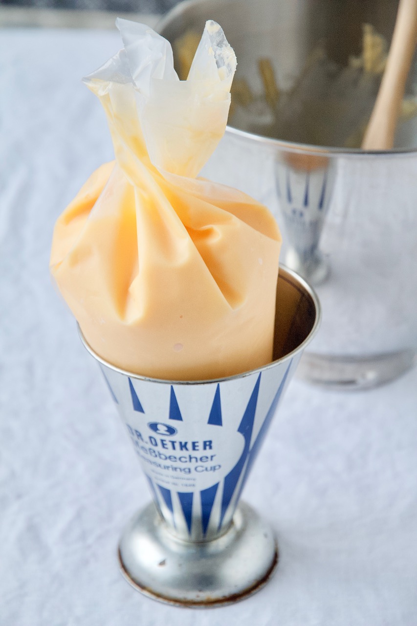 Den Teig in einem Spritzbeutel mit großer, offener Sterntülle füllen (ich glaube meine war etwas zu groß) und mit großem Abstand 12 cm lange Steifen auf einem mit Backpapier ausgelegtem Backblech aufspritzen.