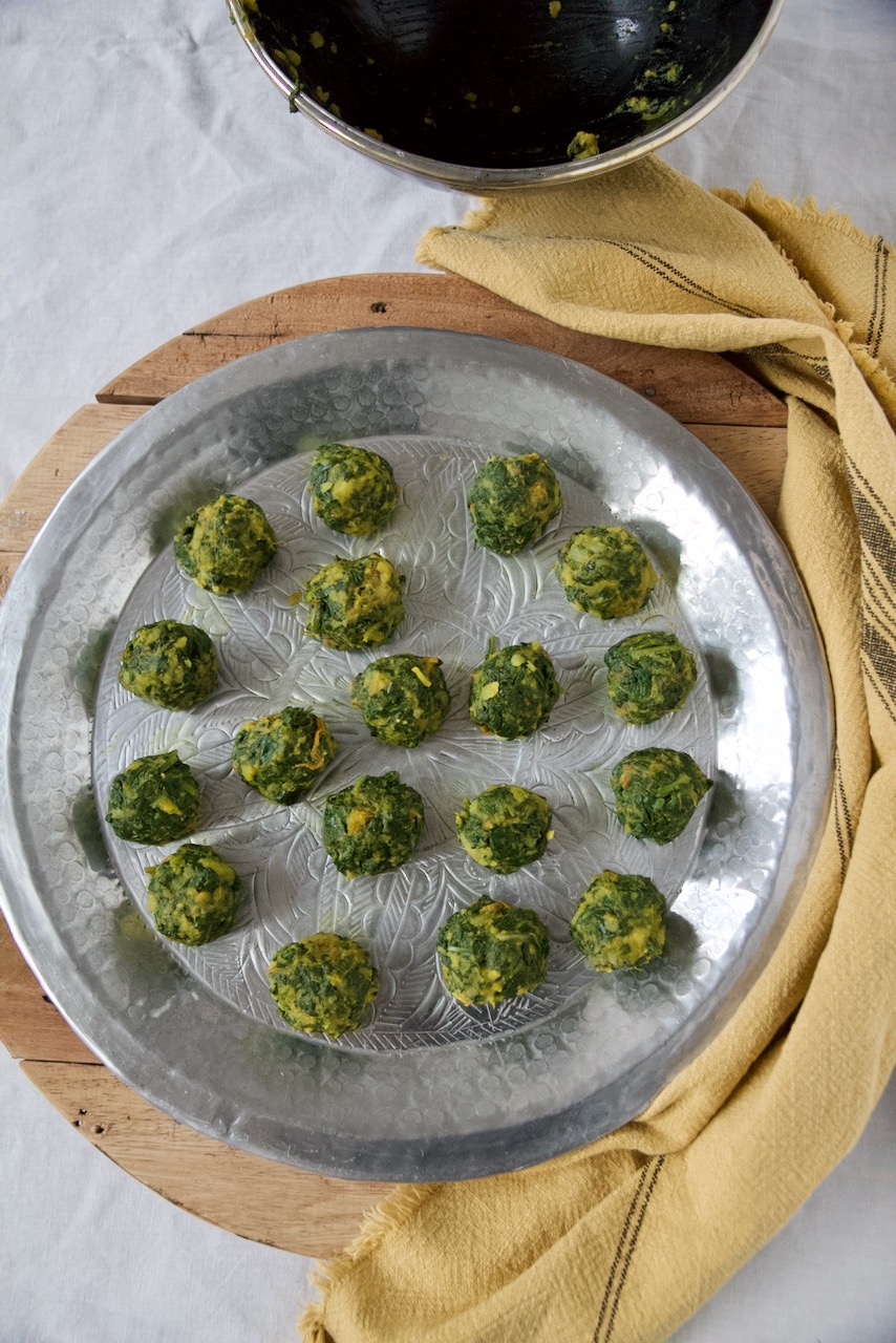 Mix boiled spinach, grated potatoes, beaten egg, fried onions and spices in a bowl and then form small dumplings.