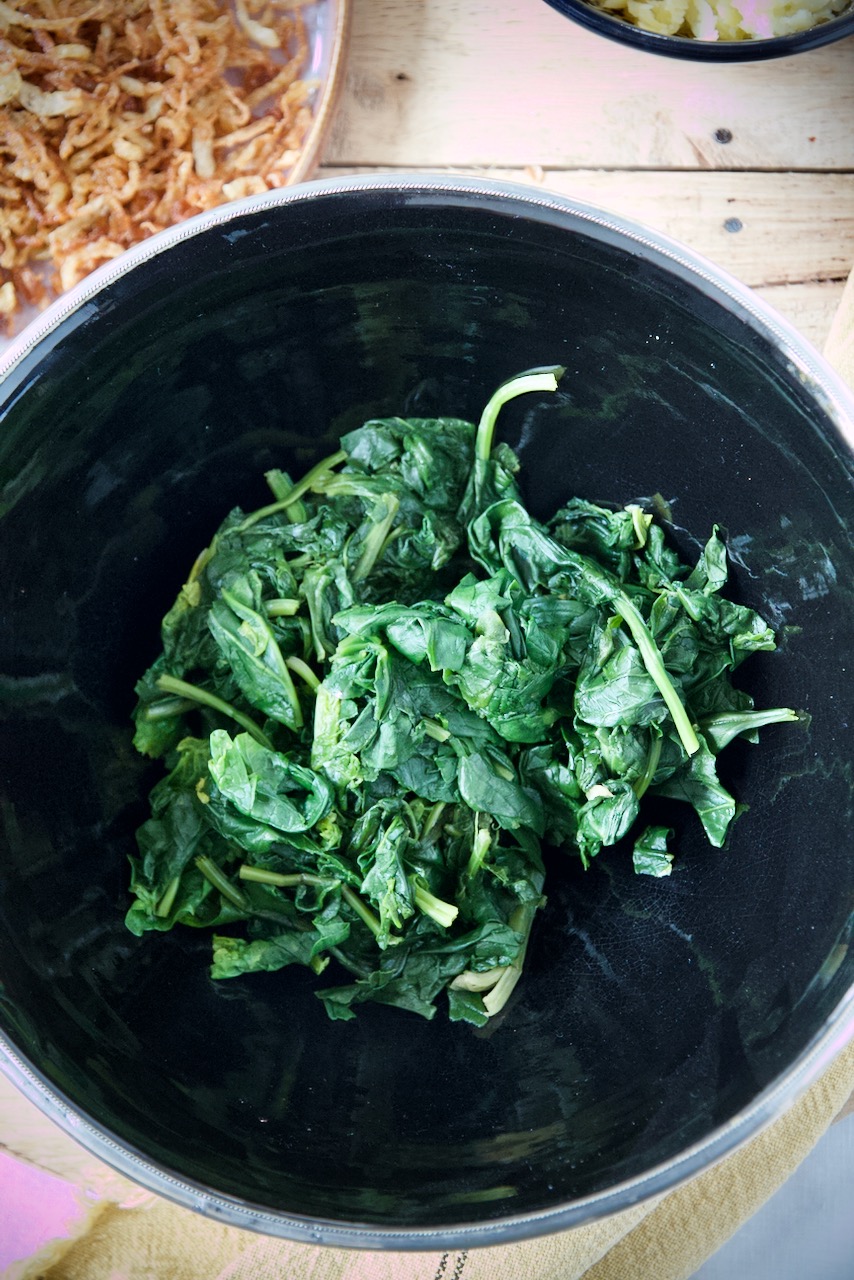 Wash spinach well, steam for 10 minutes and then let them cool down. After they have cooled down, press them out thoroughly.