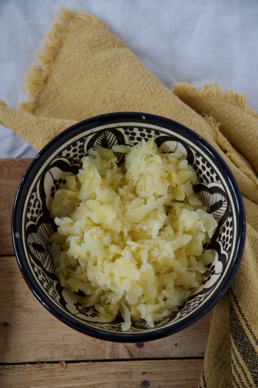 Boil the potatoes until soft, let them cool down a bit and grate them finely on a grater.