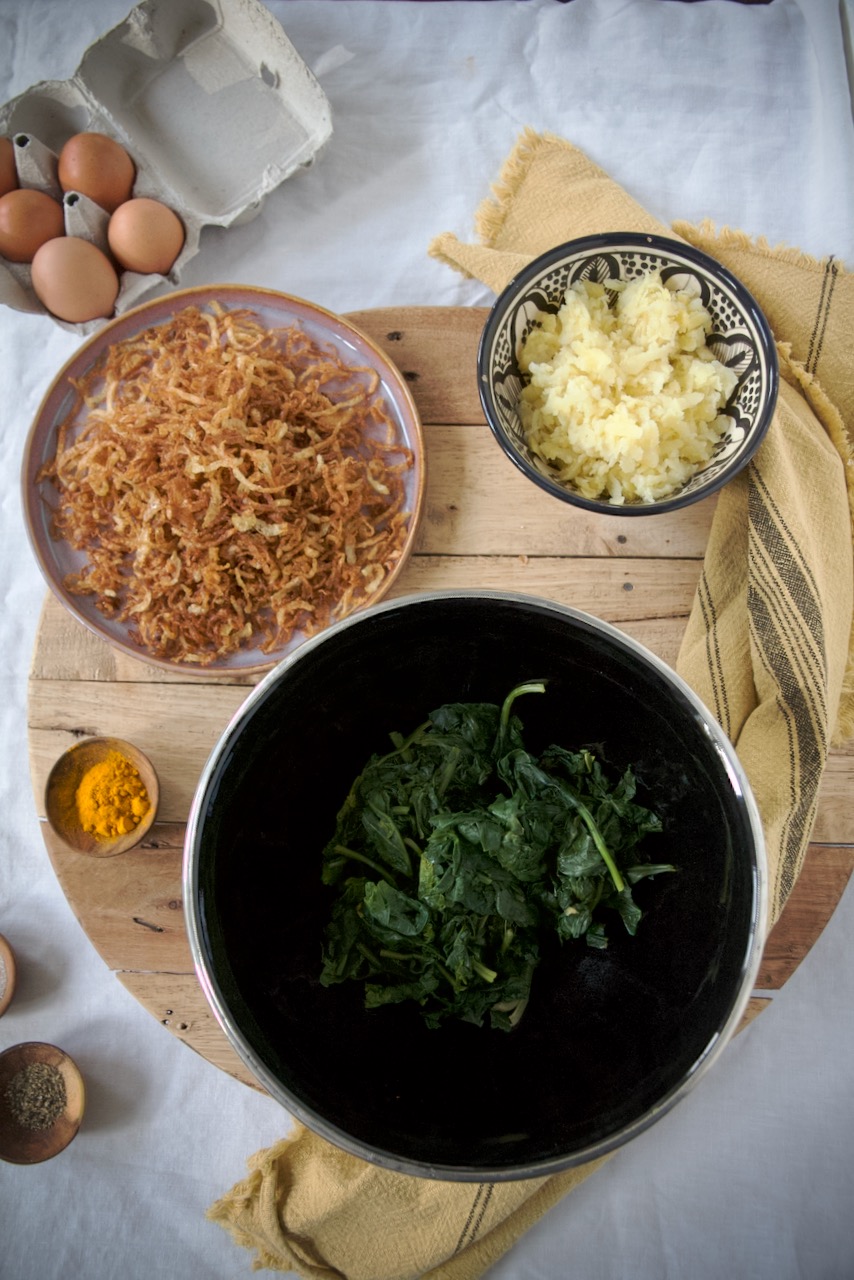 Wash the spinach well, drain it and add it to the onions in the pan, add turmeric, some water and cook it shortly. Add salt and pepper as you like.