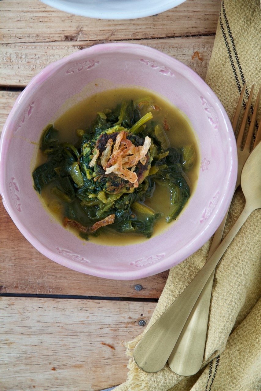 Wash the spinach well, drain it and add it to the onions in the pan, add turmeric, some water and cook it shortly. Add salt and pepper as you like.