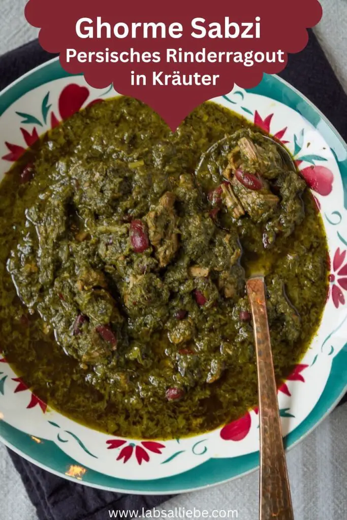 Ghorme Sabzi – Persisches Rinderragout in Kräuter ist ein beliebtes aromatisches persisches Gericht. In Ghorme Sabzi gehören 7 verschiedene Kräuter, jede Familie verwendet ihre eigenen Lieblingskräuter. In meinem Ghorme Sabzi kombiniere ich aromatische Kräuter wie Spinat, glatte Petersilie, Koriander, Dill, Schnittlauch, Bockshornkleeblätter und Frühlingszwiebeln, außerdem knackige rote Bohnen, saftiges Rindfleisch und säuerlich getrocknete Limetten. Ghorme Sabzi schmeckt köstlich zitronig, nach Kräutern und am nächsten Tag noch viel besser. Ghorme Sabzi duftet für mich wie der Frühling in Persien. Am Besten passt dazu persischer Reis , Salad Shirazi und Dugh.