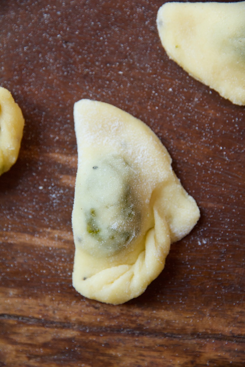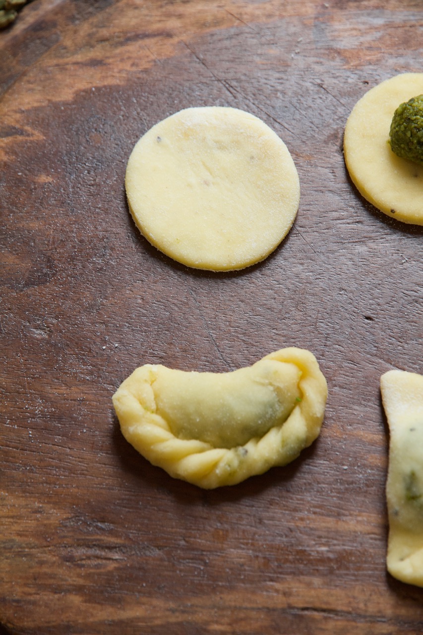 Die Teigkreise über die Füllung zu Halbmonden zusammenklappen und die Luft herausdrücken.