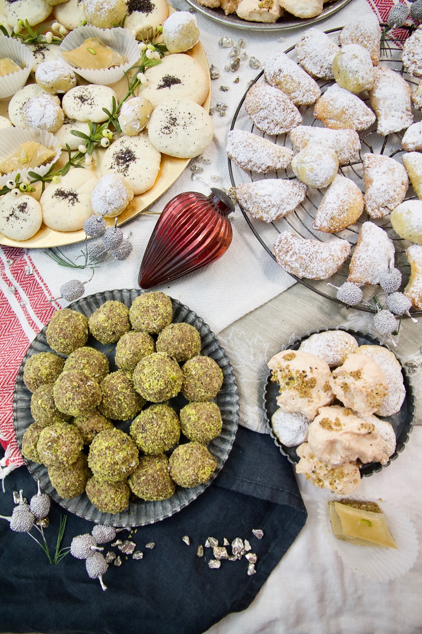 Die persischen Nowrooz Plätzchen und Kekse eignen sich auch perfekt als Weihnachtsplätzchen. Tina von Mainhomestaging hat mich in der Adventszeit gefragt ob ich nicht Lust habe einen orientalischen Backkurs zu geben. Natürlich habe ich zugesagt und die beliebten Plätzchen- und Kesksrezepte ausgesucht, die wir für Nowrooz zubereiten. Insgesamt haben wir 6 verschiedene Keks Klassiker gebacken. Zizy hat in aller Ruhe sich um das Baghlava gekümmert und die Yufka-Blätter geduldig mit geschmolzener Butter eingepinselt. Birgit von relativ jung und Tanja von bo_deko haben die Power Balls oder wie wir sagen Topak Khorma geknetet, gerollt und in gemahlenen Pistazien und Kokosnussraspeln gewältzt. Tina hat das Ghotab mit drei verschiedenen Füllungen zubereitet. Ausserdem haben wir Nan-e Berenji – Persische Reismehlplätzchen mit Mohn, Rosen-Plätzchen und Kokosmakronen gebacken. Tanja hat im Anschluss den Tisch üppig orientalisch dekoriert und mit Zizys professioneller Lichtausrüstung setzen wir die Plätzchen schön in Szene.