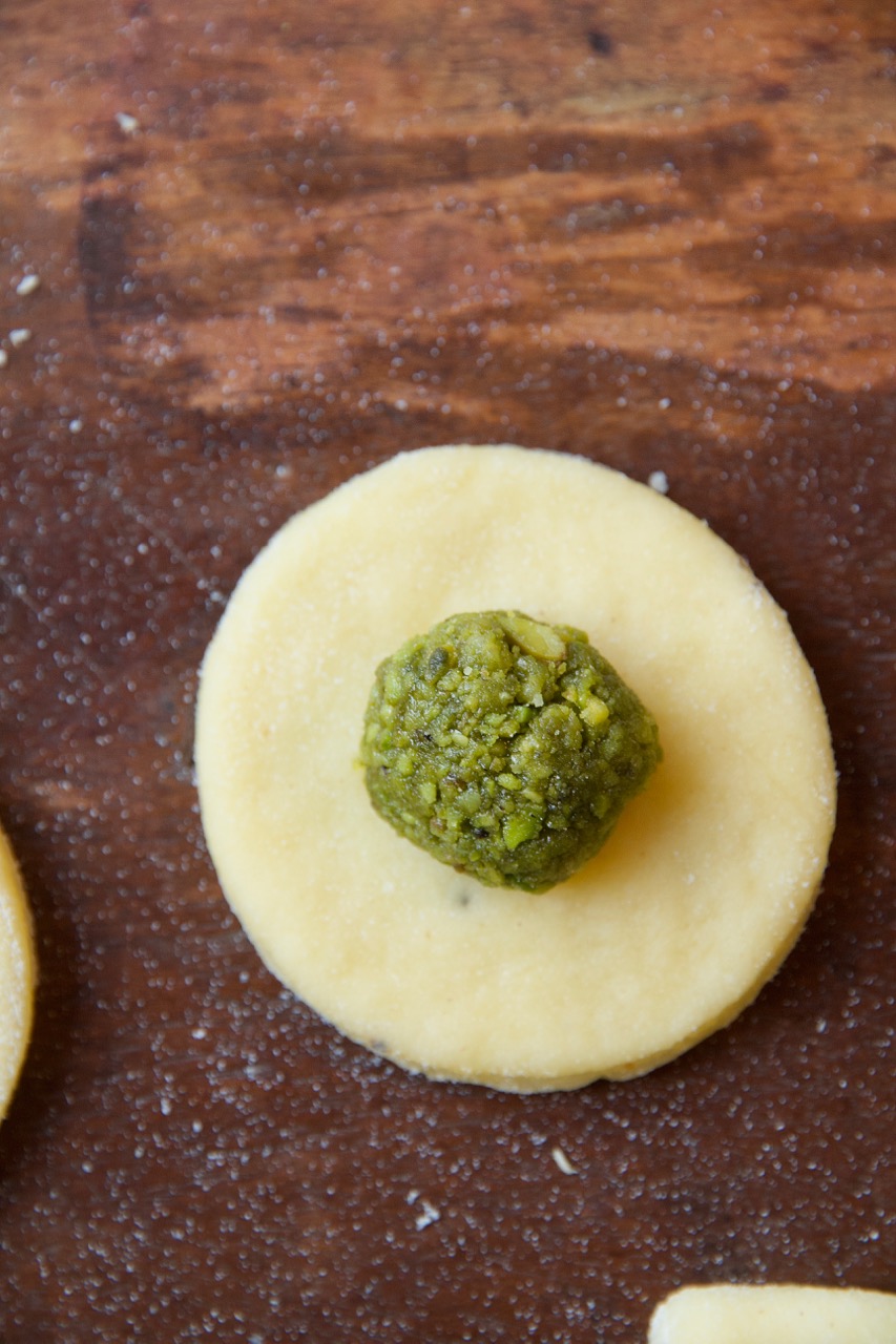Aus dem ausgerollten Teig runde Kreise ausstechen, diese mit Pistazien-Rosenwasser-Kardamom Füllung füllen. Schnapp dir ruhig ein kleines Stückchen von der Füllung und nasche, ich sage dir es schmeckt zum Niederknien lecker. Weiter geht’s! Den Teig über die Füllung zusammenklappen und mit dem Daumen und Zeigefinger am Rand fest zusammendrücken, umschlagen und rundherum weiter einschlagen. Falls du das mit dem Einschlagen nicht hinbekommst, kannst du die Seiten auch mit einer Gabel andrücken, wie bei Tortellinis. Oder du machst kleine runde Kugeln, alle diese drei Versionen sind in Persien Gang und Gebe.