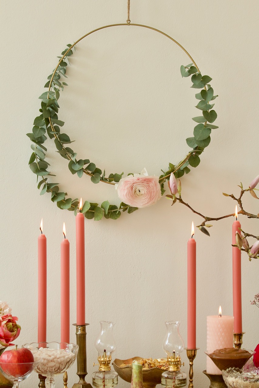 Dieses Jahr habe ich meinen Haft Sin für Nowrooz ganz romantisch im trendigem Vintage Boho-Style gestaltet. Lässig kombiniere ich Vintage Glasschalen mit Messing Kerzenständer und Vasen. Akzente setzen ein Blumenring an der Wand und Kerzen in warmem „Living Coral“, die Farbe des Jahres 2019. Den Eukalyptus-Ranunkel Kranz habe ich aus echten Pflanzen selber gebastelt. Einfach mit einem Stück Draht die Pflanzen um den Messingring wickeln und das obere Teil vom Ring frei lassen. Weitere Haft Sin Impressionen findest du hier: rustikal von 2018 , Urban Jungle von 2017, Romantisch von 2016. Hier findest du alles rund um das Thema Nowrooz.