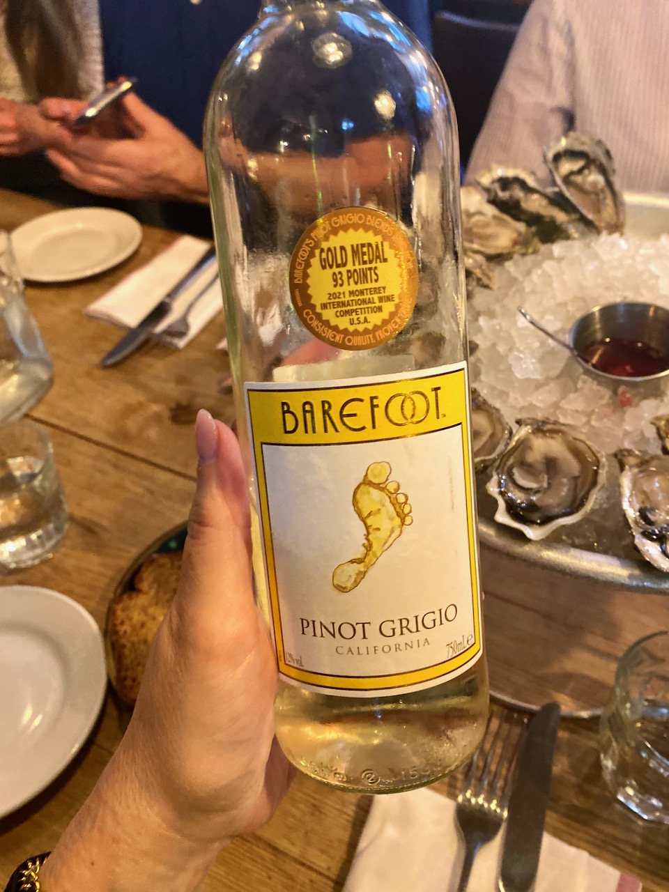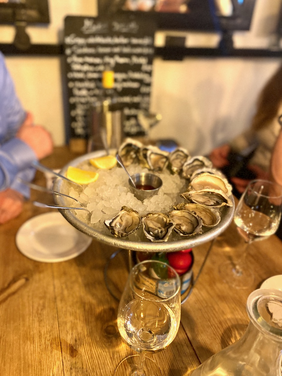 Die Spezialität des Restaurants sind selbstverständlich Austern aus aller Welt. Wir genießen eine Austernplatte und dazu gibt es den Pinot Grigio von Barefoot Wine. Der Pinot Grigio riecht angenehm fruchtig und erinnert an gelbe Früchte wie Apfel und Pfirsich sowie an Zitrusfrüchte. Der Wein schmeckt so, wie er riecht: fruchtig und frisch, mit einer milden und harmonischen Säure. Sehr lecker! Unsere Challenge hier ist es, so viele Austernarten wie möglich zu erraten, dabei können wir uns ganz nebenbei im Lokal umsehen.