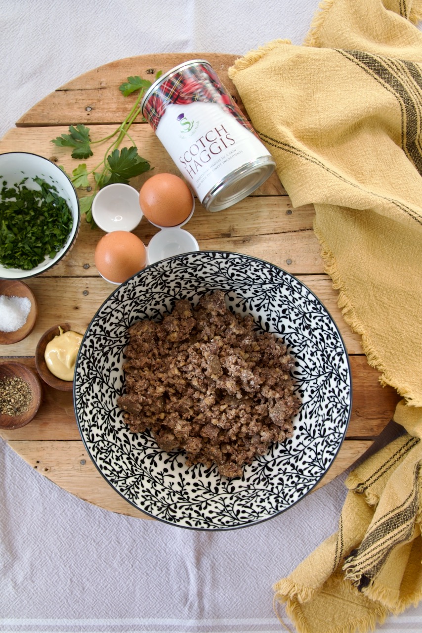 Zunächst die Petersilie waschen, gut abtrocknen und fein hacken. Zwei der Eier etwa 5 min. weich kochen, in eiskaltes Wasser legen, damit das Eigelb nicht noch härter wird. Haggis mit der Petersilie, Dijon Senf, Salz und Pfeffer in eine Rührschüssel geben. Alles gut vermengen. Die fertige Masse teilen, flach drücken und um das geschälte Ei wickeln.