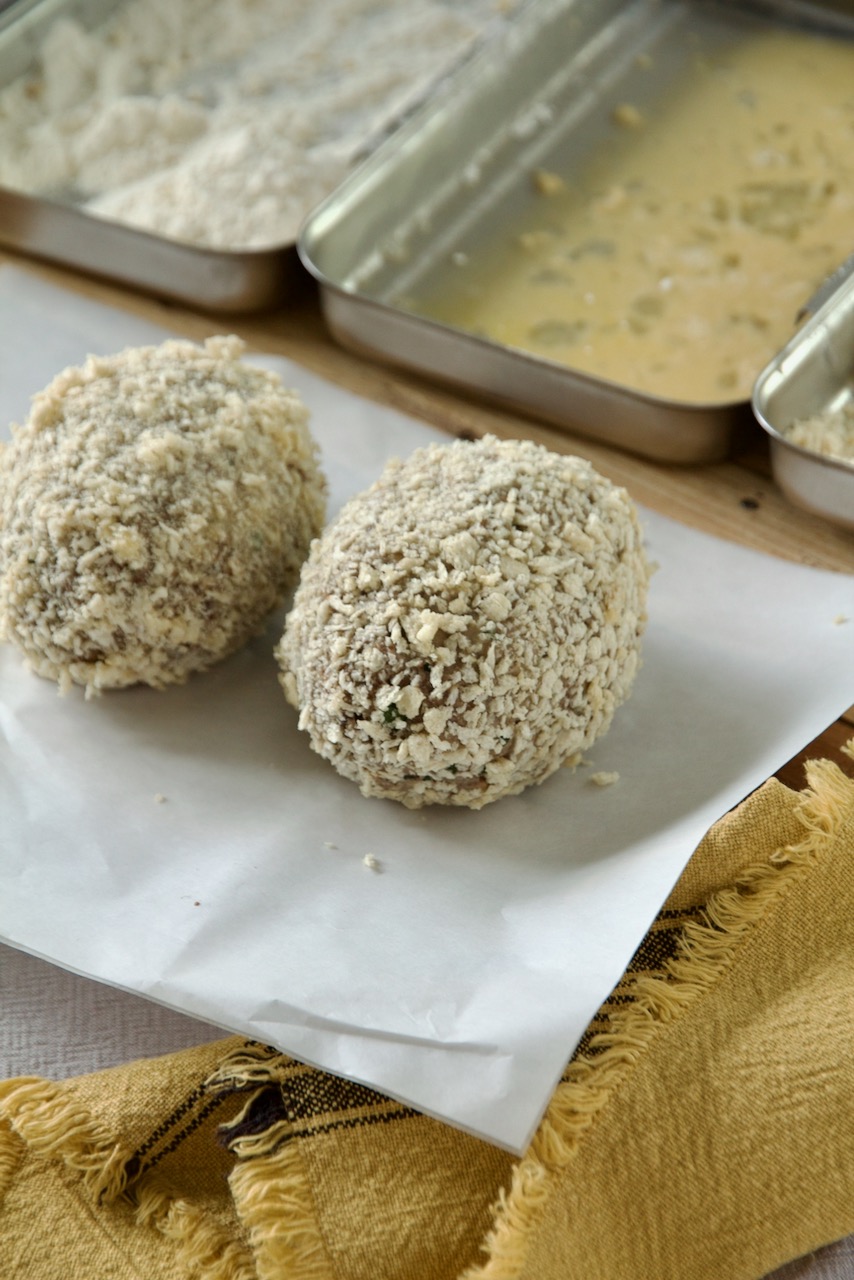 Haggis Scotch Eggs sind weichgekochte Eier, die von einem Mantel aus Haggis und einer knusprigen Panade aus Panko und Paniermehl umhüllt sind.
