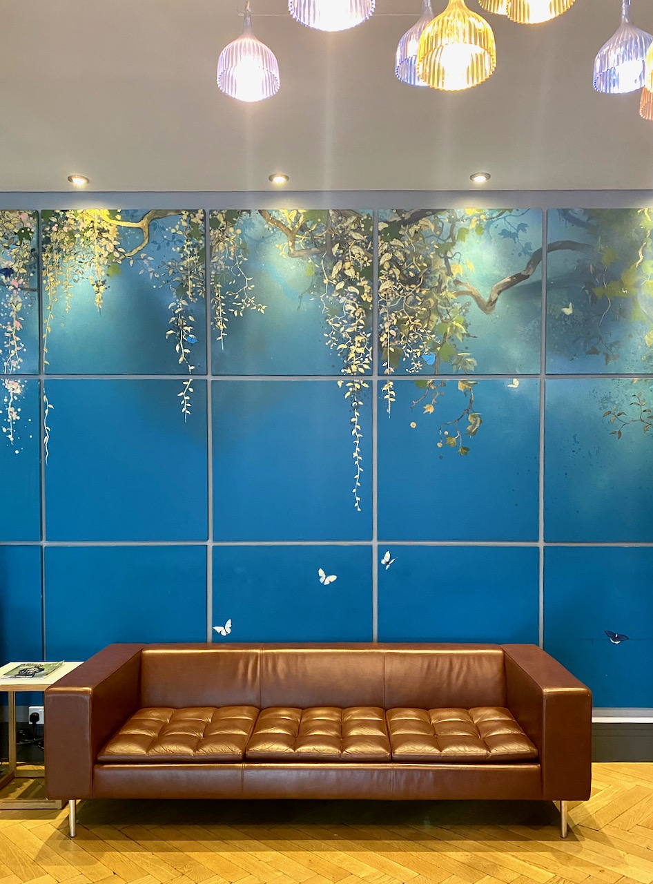 Nach diesen wunderschönen Stunden bette ich mich in meinem Cosy Zimmer im Boutiquehotel Malmaison, Charterhouse Square. Ein kleines Fläschen Pinot Grigio als Gute Nacht Schlummer lacht mich vom Bett aus an. Wer beruflich oder privat in London auf der Suche nach einem coolen und bezahlbaren Hotel ist, wird begeistert sein. Das imposante Gebäude, das früher ein Schwesternwohnheim beherbergte, ist heute ein stilvolles Boutiquehotel in einer ruhigen Seitenstraße. Die Lage ist perfekt und nur wenige Schritte von der Barbican Underground Station entfernt. Die Möbel in der Lobby sind vom britischen Möbelhersteller Hitch Mylius und werden immer mal wieder durch neue ausgetauscht. Nicht nur die Wand im Eingangsbereich, sondern auch die fast 100 Zimmer sind von Xenz, einem sehr bekannten Londoner Graffiti-Künstler, mit seinen unverkennbaren Ranken, Schmetterlingen, Blumen und Vögeln bemalt. Im Keller ist das hauseigene Restaurant Chez Mal im Stil einer französischen Brasserie. Neonleuchten und auch hier wieder Wandkunst verzieren die Wände des Restaurants.