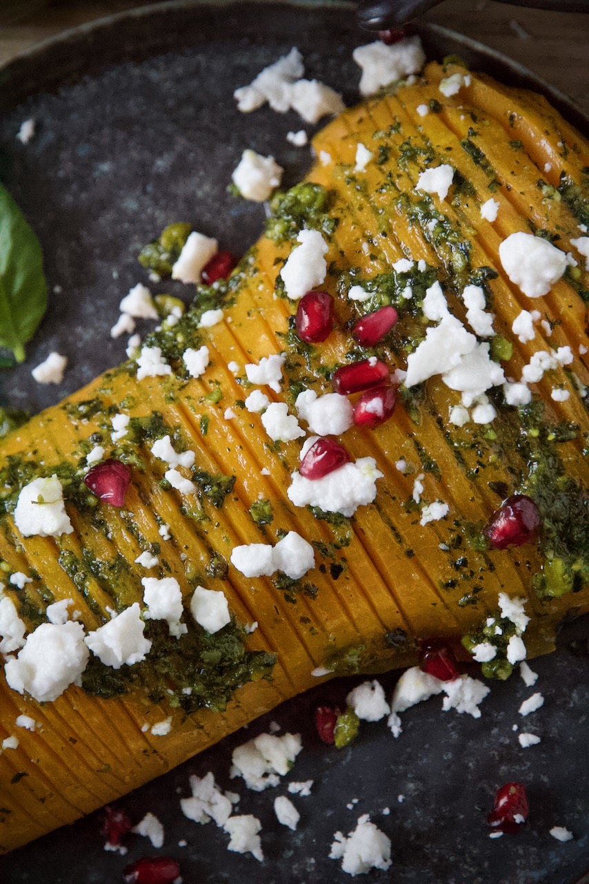 Hasselback Butternut-Kürbis mit Feta, Pistazien-Pesto und Garanatapfelkernen