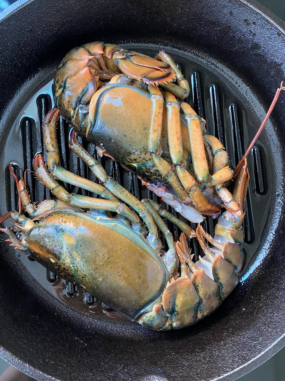 Season lobster halves with salt and pepper, sear first on the meat side for about 2 min. Then turn to the shell side and fry for another 2 min.