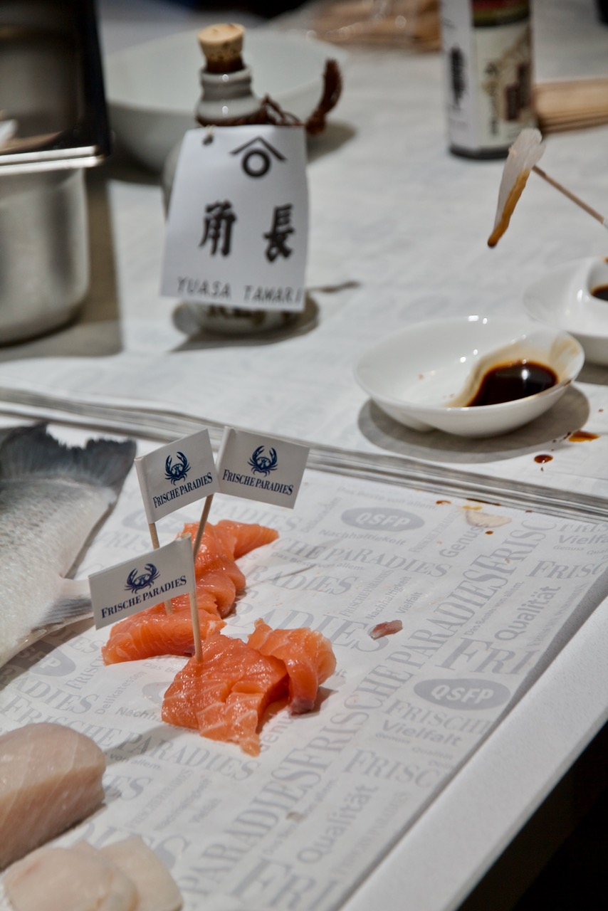 An der Fischtheke gibt es eine erste Kostprobe. Roher frischer Cobia, Cadiz Wolfsbarsch und Lachsloin werden filetiert und in feinen Scheiben geschnitten. Die wirklich köstlichen Filets in Sashimi Qualität tauchen wir in 3 verschiedene Soja Saucen und geniessen sie. Mein Favorit ist die Soja Sauce „Yuasa Tamari“ , die in einem 150 Jahre alten Zedernfaß gebraut wird und den Umami Geschmack in sich trägt. Abgefüllt wird sie in edel glasierter Tokkuri-Keramik. Ich bin so begeistert, dass ich mir direkt eine kaufe, denn der Geschmack ist unvergleichlich. Drei Stücke Cobia Filet habe ich ebenfalls mitgenommen, daraus bereite ich Ceviche zu.