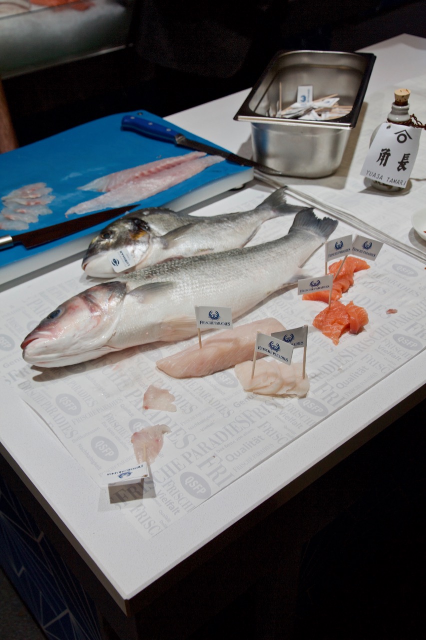 Nach der freundlichen Begrüßung mit einem Gläschen Riesling Sekt von Strauch, beginnt die Führung mit Christian Horaczek, Ulrich Wittur und dem Fischsommelier Jörg Jagode an der neuen Fischtheke. Diese ist bestückt mit mehr als achtzig bis neuzig Frischfischartikel, von Süß- und Salzwasserfisch bis hin zu Muscheln und Krustentiere. Es riecht nach Meerwasser, denn der Fisch ist absolut frisch und höchstens 48 Stunden vorher aus dem Meer gefischt worden.