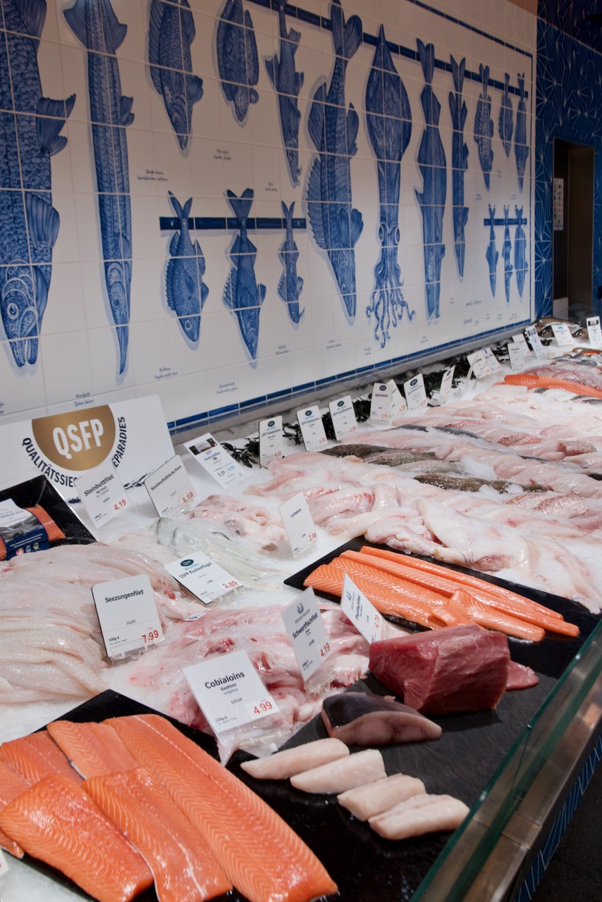 Ein besonderer Eye-Catcher ist die Fliesenwand mit Fischmuster hinter der Fischtheke, die von der Künstlerin Annelie Somborn per Hand gemalt wurde. Die Fliesenwand zeigt die ganze Palette an Fische, die auch im FrischeParadies angeboten werden. Die Fische sind detailgetreu gemalt und mit ihrem deutschen und lateinischen Namen beschriftet.