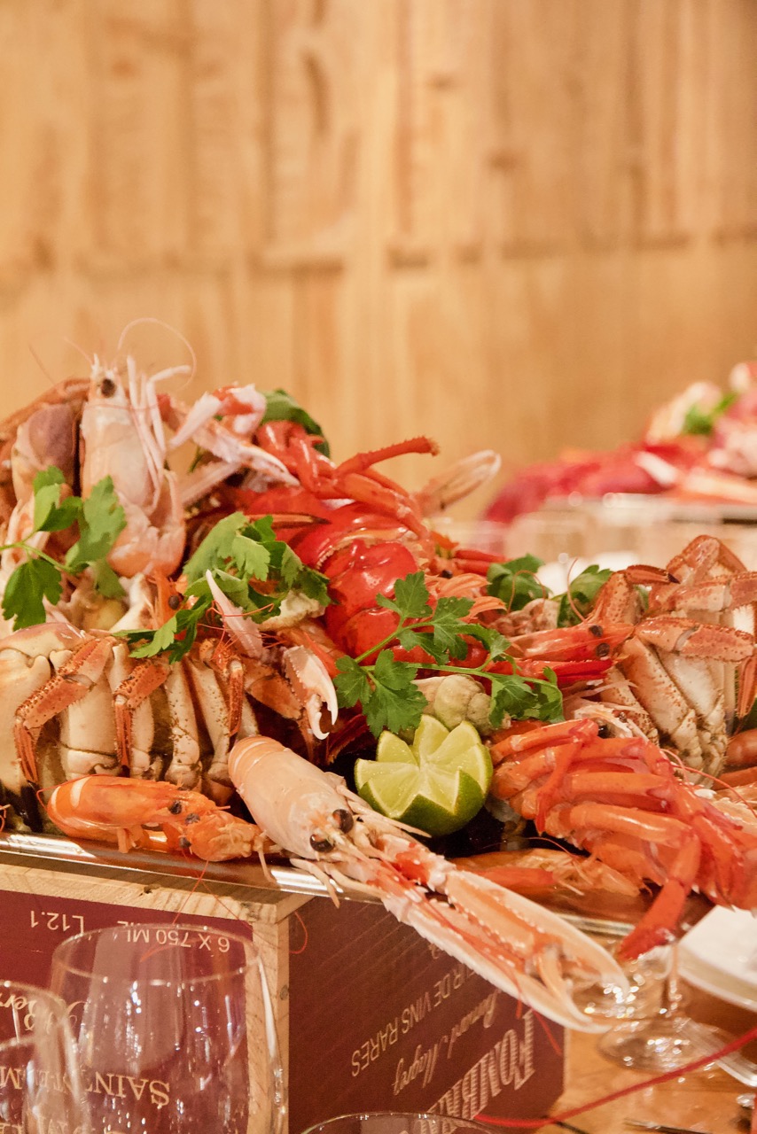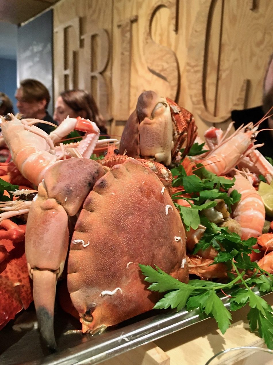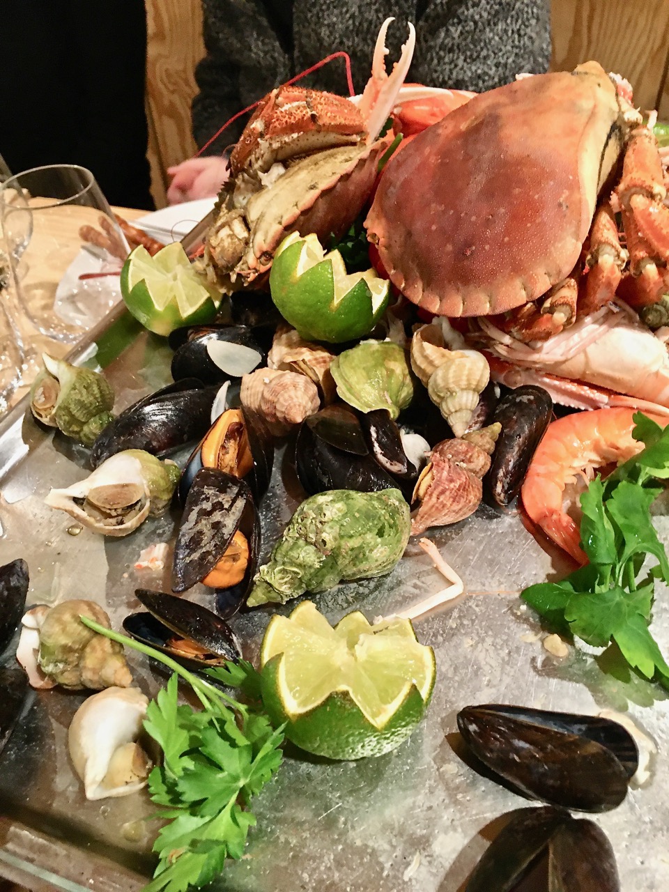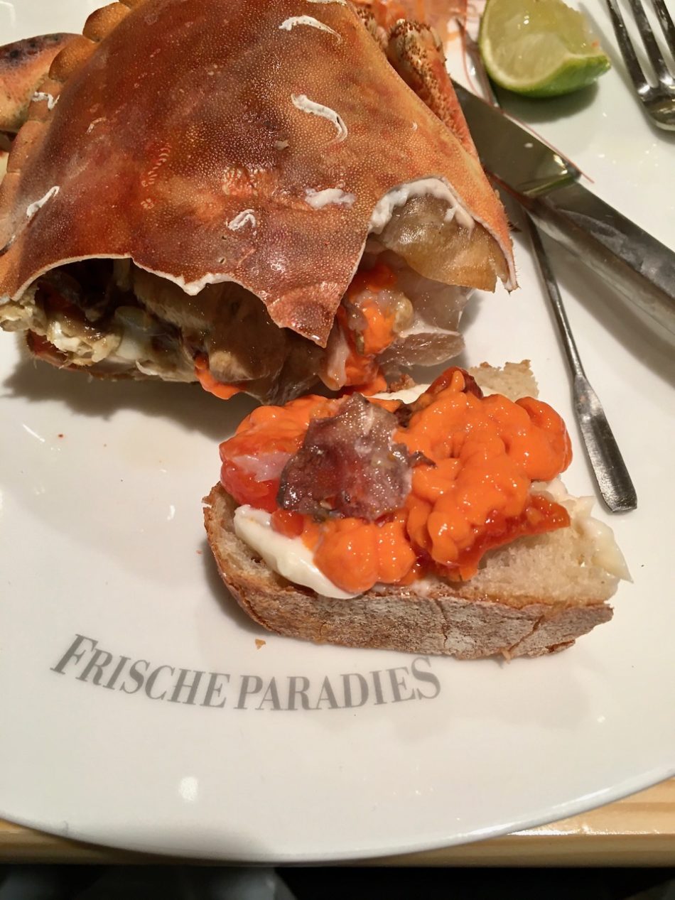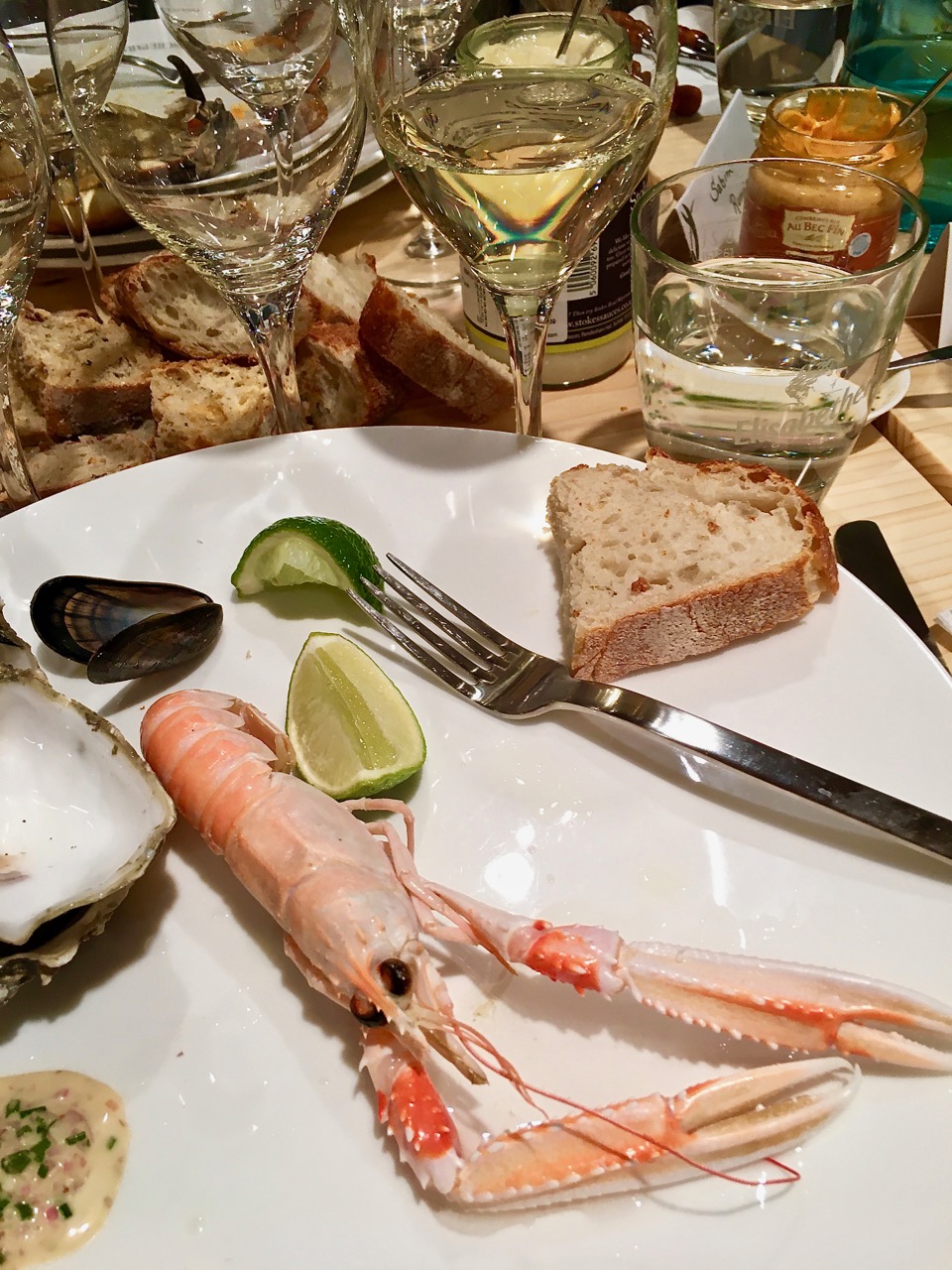 Nach der Führung erwartet uns im Bistro von FrischeParadies ein opulent gedeckter Tisch mit Krusten- und Schalentiere zur Verkostung. Das Centerpiece ist beladen mit Köstlichkeiten aus Hummer, Taschenkrebse, handverlesene bretonische Kaisergranate, Atlantik Garnelen aus Wildfang, Seeschnecken und Föhrer Miesmuscheln. Stokes Mayonnaise*, Rouille du pêcheur* eine scharfe rote südfranzösische Knoblauchsauce und hausgemachte Vinaigrettes werden zu den Krustentieren gereicht.