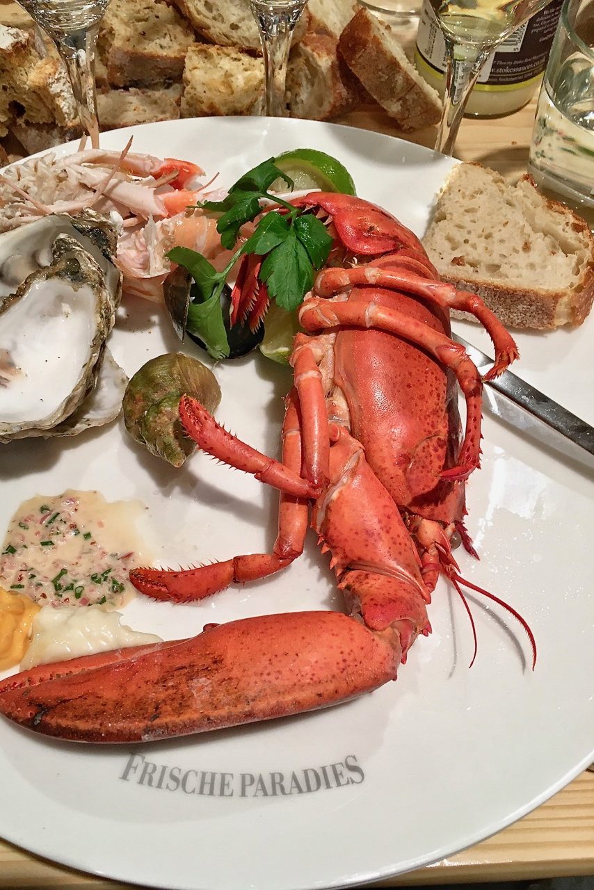 Zunächst mache ich mir etwas Gedanken um Tischmanieren beim Hummer essen. Wer schon mal Hummer gegessen hat, weiß bestimmt was dieser für eine „Sauerei“ macht. Am einfachsten ist es, ihn mit den Händen zu essen und das gefällt mir richtig gut. Nicht nur Hummerzange, sondern auch Nussknacker und Hummer Besteck liegen bereit und es kann losgehen. Als das Team von FrischeParadies einen Riesenlatz anbietet, bin ich wirklich erleichtert.