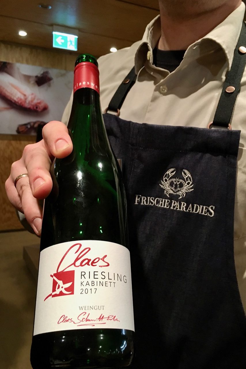 Zum Hummer & Co. kredenzt Weinsommelier Herr Ebeling drei verschiedene Weine, Riesling Kabinett vom Weingut Claes Schmitt Erben an der Mosel, Weiß-Grau* aus der Rebsorte Weiß- und Grauburgunder vom Weingut Bercher und einen trockenen Weissburgunder vom Weingut Battenfeld-Spanier (Winzer des Jahres 2018). Alle Weine schmecken vorzüglich, habe ich schon erwähnt, dass ich Riesling liebe. Einen kleinen Fauxpas 😉 gibt es dennoch! Irgendwie landet doch noch etwas Hummerpanzer in meiner Lockenpracht.
