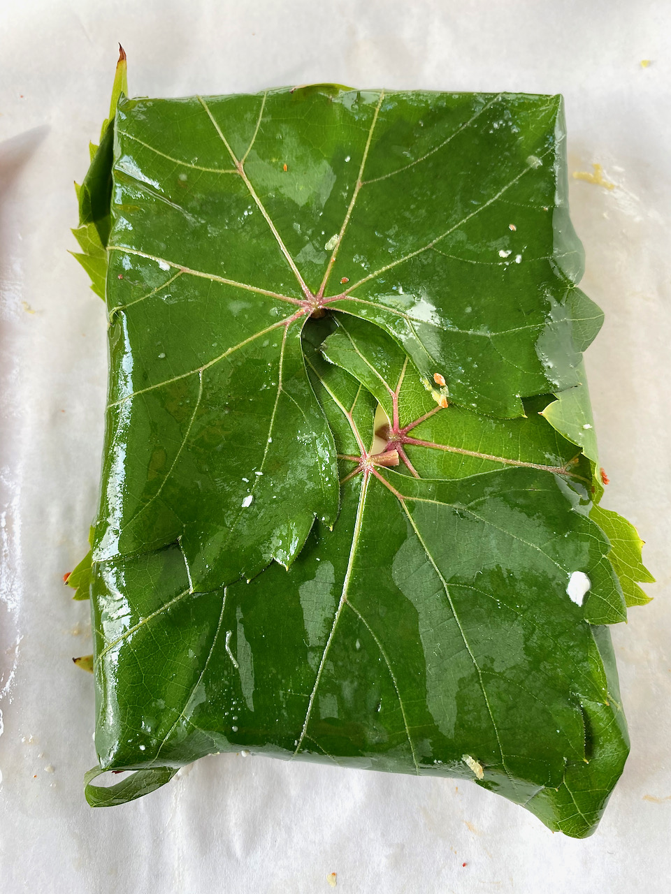 Drizzle with 1 tsp. of maple syrup and 1 tsp. olive oil and wrap in washed and well-dried vine leaves to make a pretty package. If you are using pickled grape leaves, wash and dry them well beforehand. Depending on the size of the vine leaves, you will need 3 - 4 vine leaves per feta.