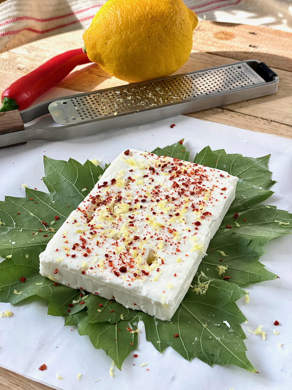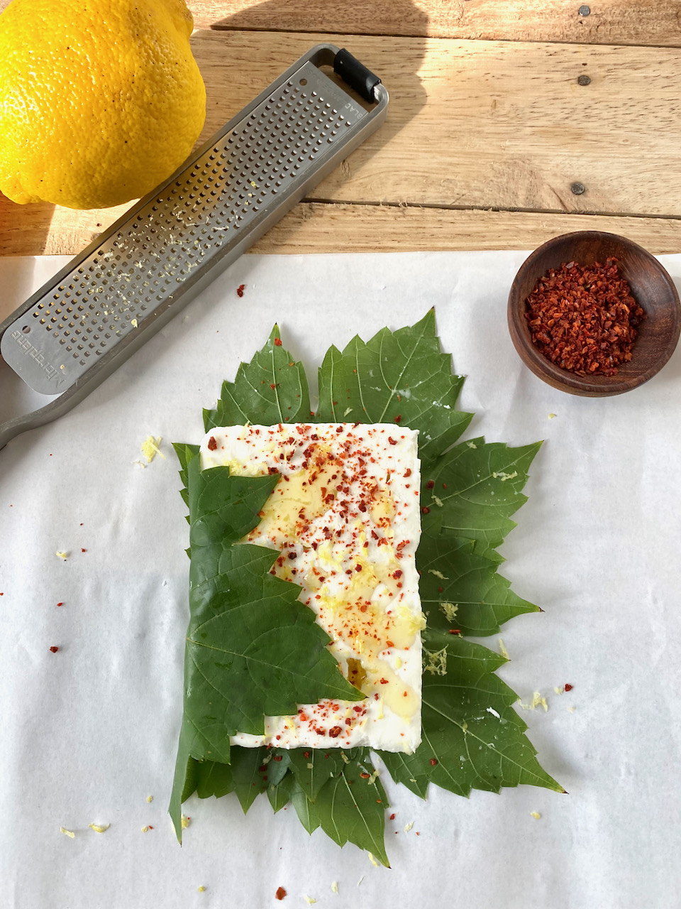 Top each feta with 1/4 tsp chili flakes and 1/4 tsp lemon zest.