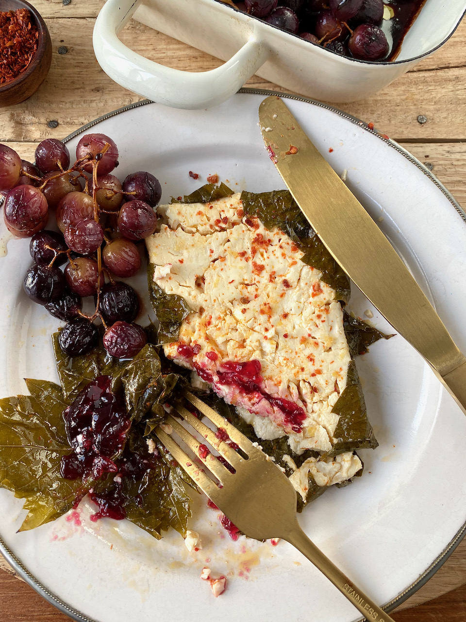 Feta grilled in vine leaves with roasted grapes