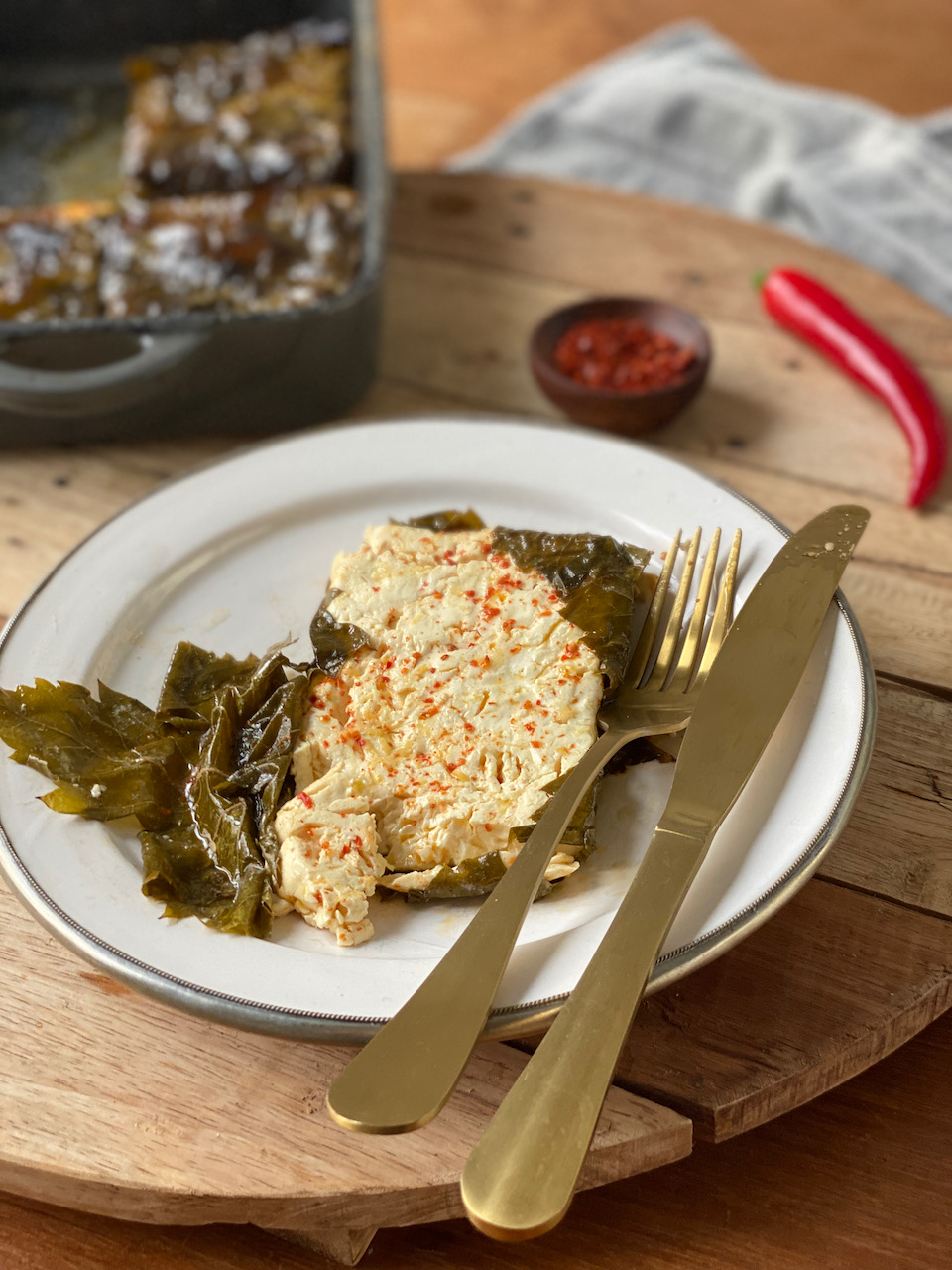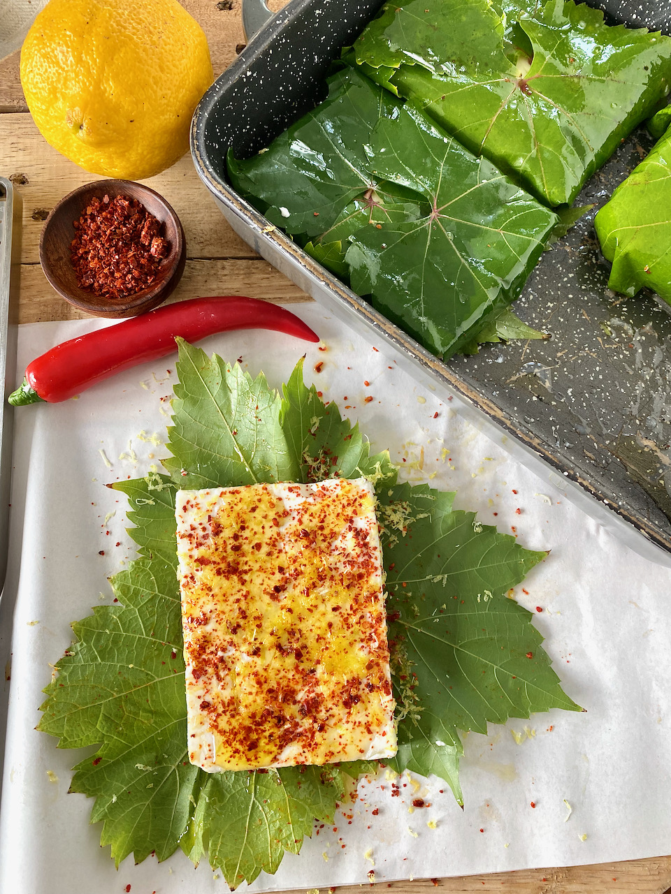 ZUBEREITUNG IN WEINBLÄTTER GEGRILLTER FETA