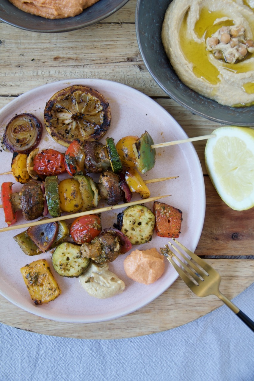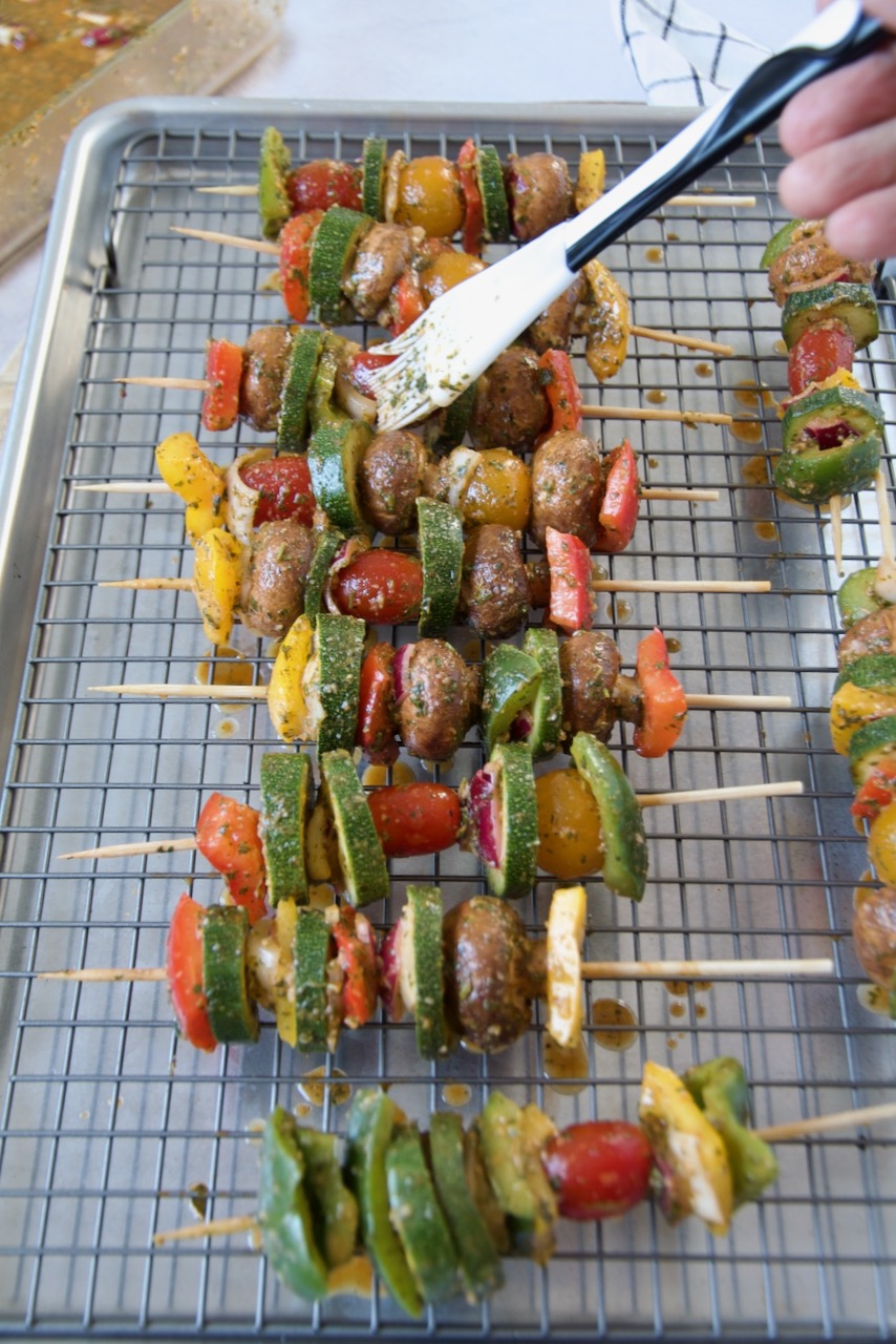 Eine halbe Stunde bevor es los geht, die Spieße in kaltes Wasser legen. Das verhindert, dass sie später beim Grillen verbrennen. Das Gemüse abwechselnd auf einen Spieß stecken, mit der restlichen Marinade einreiben und über dem Grill oder in einer Grillpfanne mit etwas Öl rundherum anbraten bis das Gemüse al dente gegrillt ist, dauert ca. 5 – 8 Minuten. Im Backofen: Grill auf 220° einstellen und für 20 – 30 min. grillen. Airfryer Version: bei 180° 5-7 Minuten.