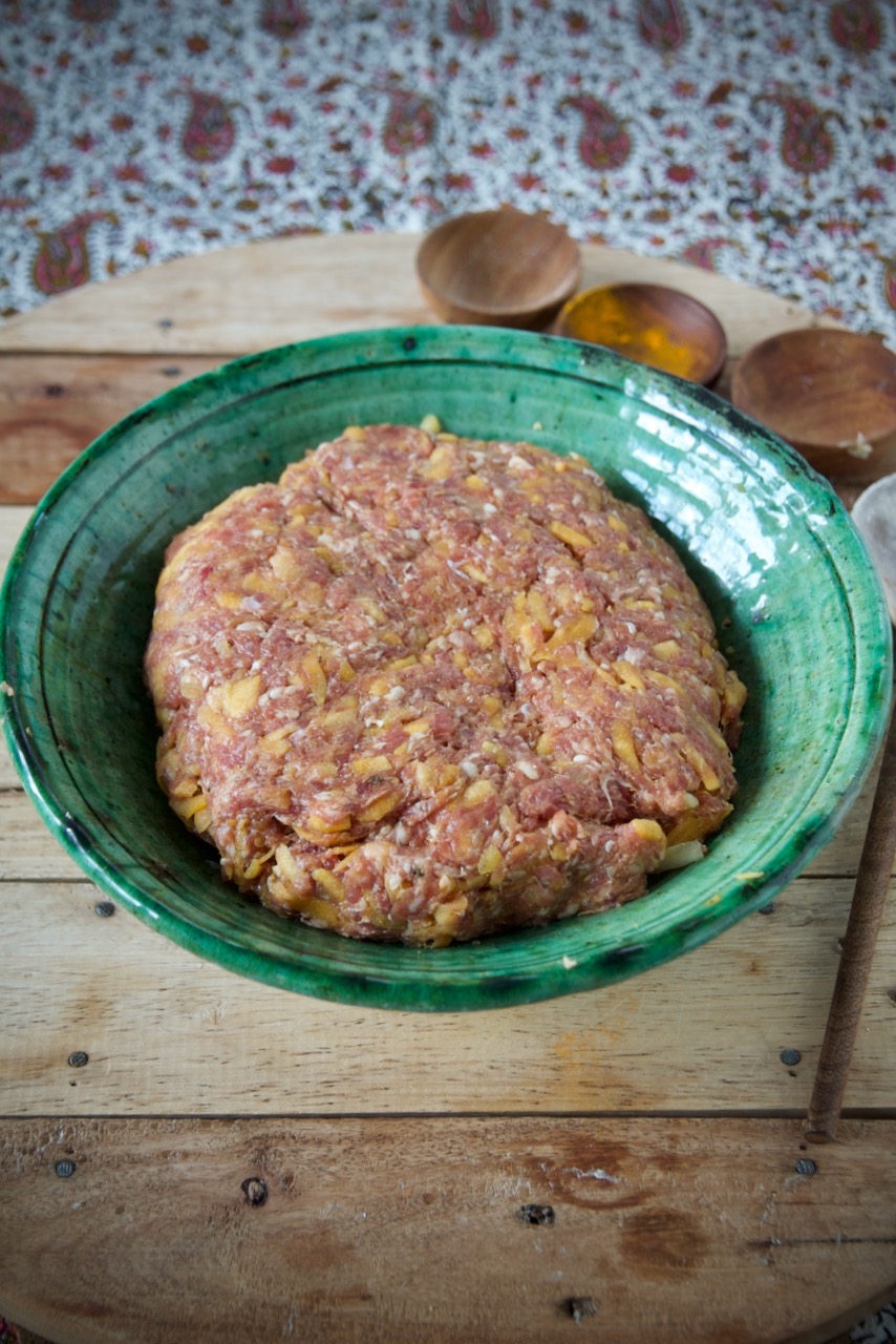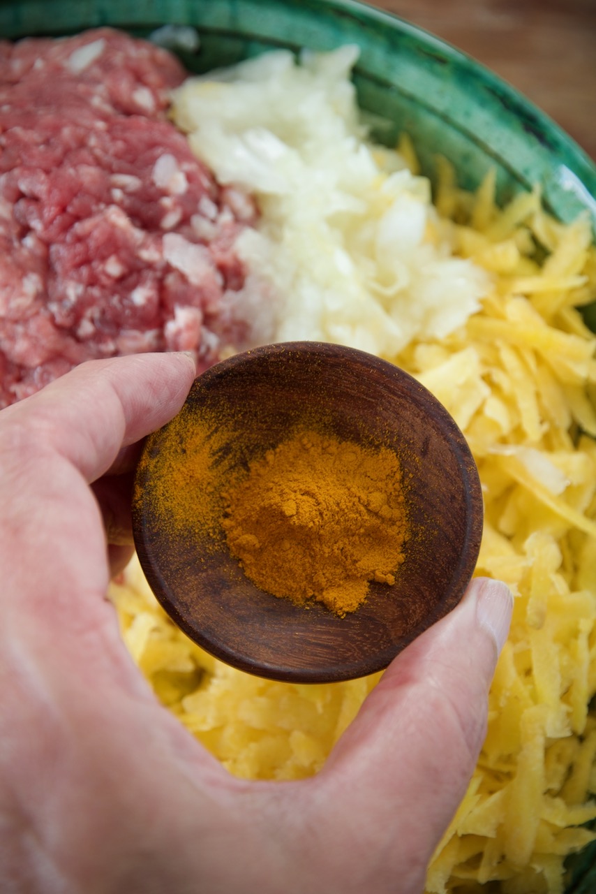 Lammhack mit geriebenen Karotten, Zwiebeln, Kurkuma, Salz und Pfeffer gut durch kneten.