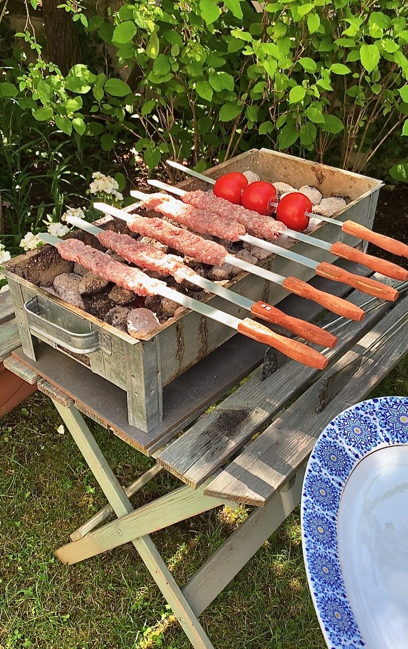 Gemeinsames Grillen und picknicken im Freien an einem rauschenden Bach, ist eines der intensivsten Erinnerungen an meine Kindheit in Persien. Wenn ich heute noch daran denke, steigen meine Glückshormone wieder kräftig nach oben. An heißen Tagen haben wir alles zusammen gepackt und sind mit dem Auto in die Berge gefahren, denn hier oben ist es immer schön kühl. Das wichtigste, was wir gut gekühlt in unseren Kühlboxen dabei hatten, war natürlich Kabab Koobideh, ausserdem Seekh (persische breite Grillspieße), Holzkohle und einen Manghal – ein persischer Grill. Vielerorts in Persien wird noch nicht einmal ein Manghal verwendet, oft werden einige Backsteine oder gar größere herumliegende Steine zu einem kleinen Grill aufgetürmt und die Kohle einfach in die Mitte gekippt, diese Version finde ich am authentischsten.