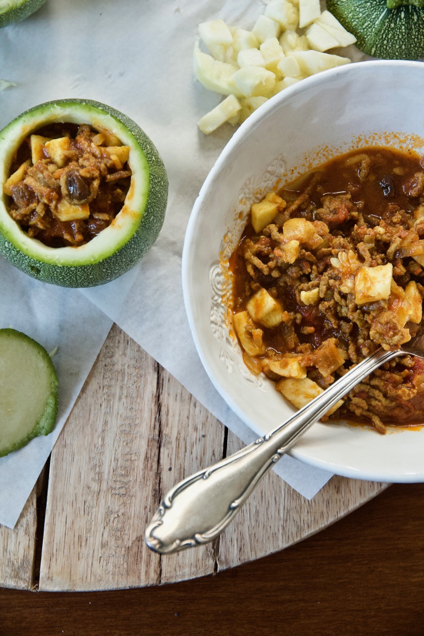 Gefülltes Gemüse oder Obst wird bei uns auch Dolmeh oder Shekampor genannt, was ganz einfach gefüllter Bauch bedeutet. Für eine vegetarische und vegane Version kannst du ganz einfach das Hackfleisch weglassen, es schmeckt auch ohne köstlich. Gefülltes Gemüse ist in Persien sehr beliebt und alle Gemüsesorten, die sich befüllen lassen werden dementsprechend gerne gefüllt. Auf meinem Blog gibt es bereits einige Rezepte für gefülltes Gemüse. Die Füllung passt übrigens auch sehr gut in „normale“ Zucchini, Auberginen, Tomaten, Quitten, Weinblätter, Spitzpaprika oder Paprikaschoten.