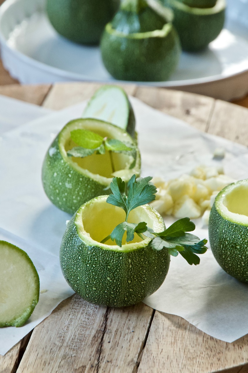 Rondinis ca. 1 cm unter dem Stielansatz aufschneiden und mit einem Löffel aushöhlen, das Fruchtfleisch in Würfel schneiden und Beiseite stellen.