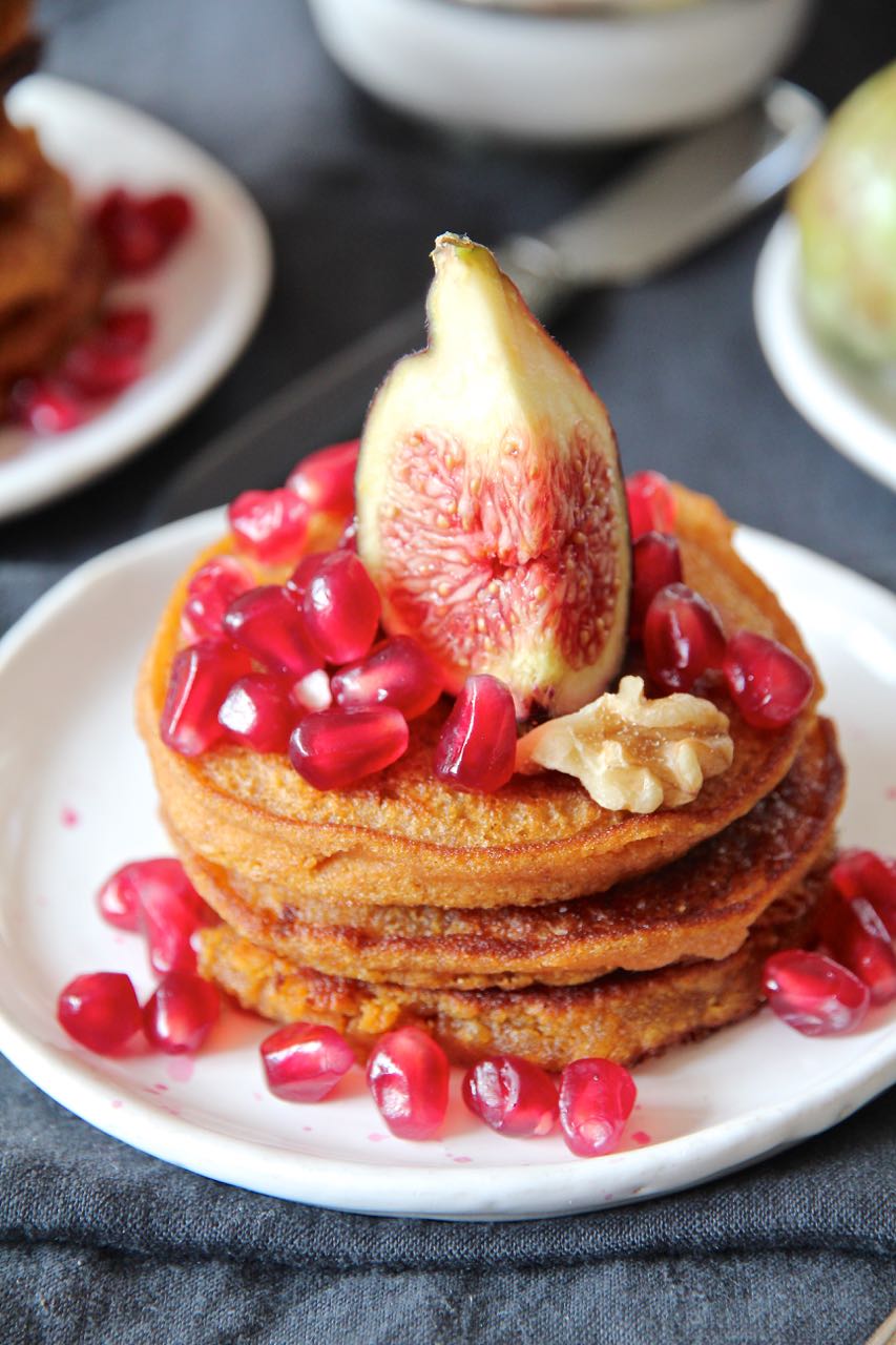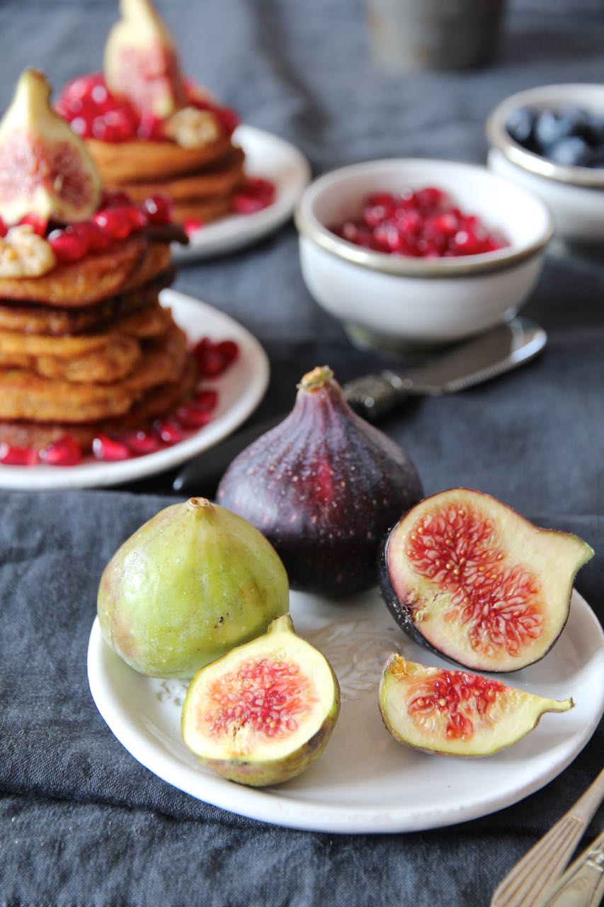 Kokosöl in eine Pfanne bei mittlerer Hitze erhitzen. Mit einer kleinen Kelle etwas Teig in die Pfanne geben. Ich habe in einer mittleren Pfanne jeweils 4 kleine Kürbispancakes ausgebacken. Warm servieren und entweder mit Puderzucker bestäuben oder mit Dattelsirup beträufeln. Granatapfelkerne, Feigen und Blaubeeren dazu reichen.