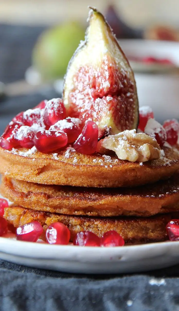Warm servieren und entweder mit Puderzucker bestäuben oder mit Dattelsirup beträufeln. Granatapfelkerne, Feigen und Blaubeeren dazu reichen.