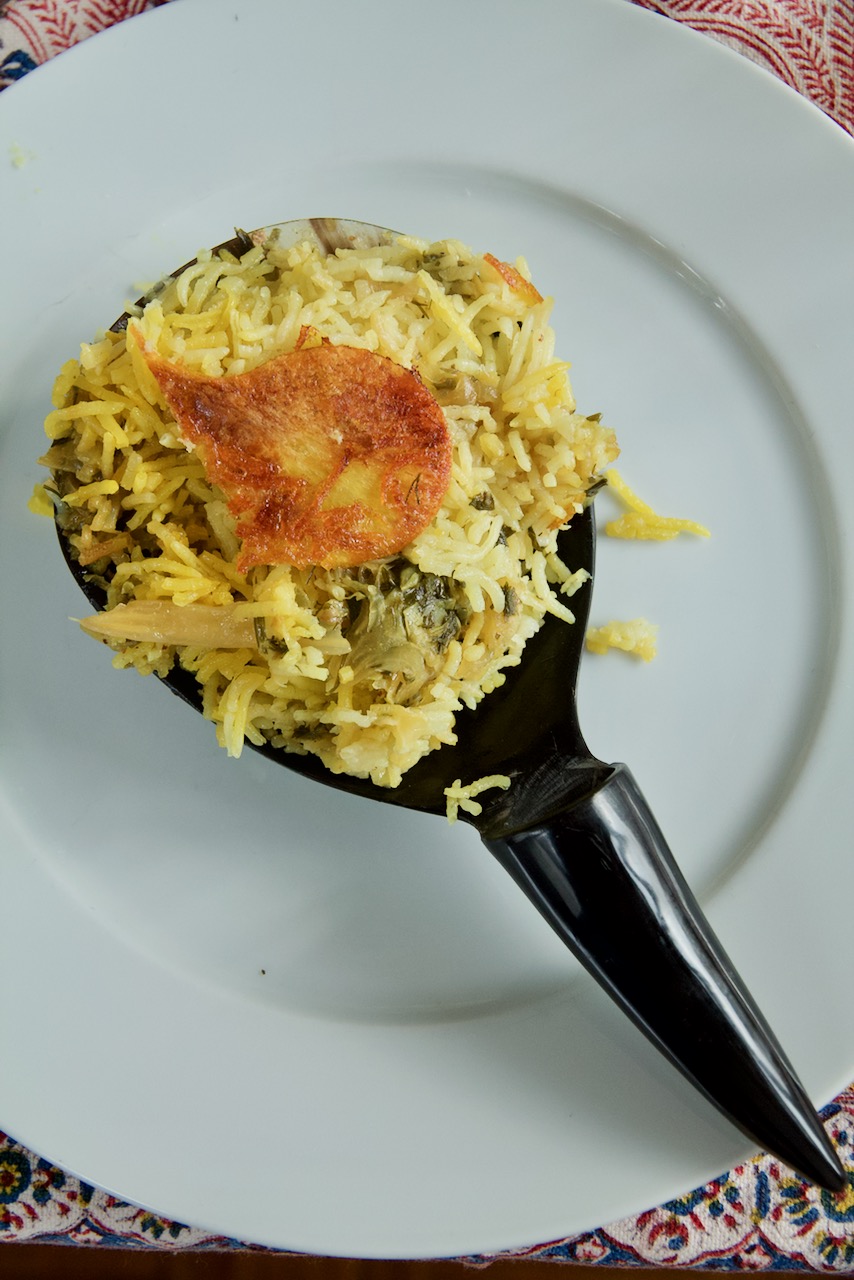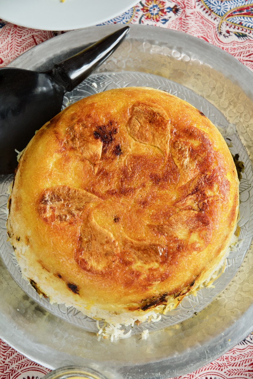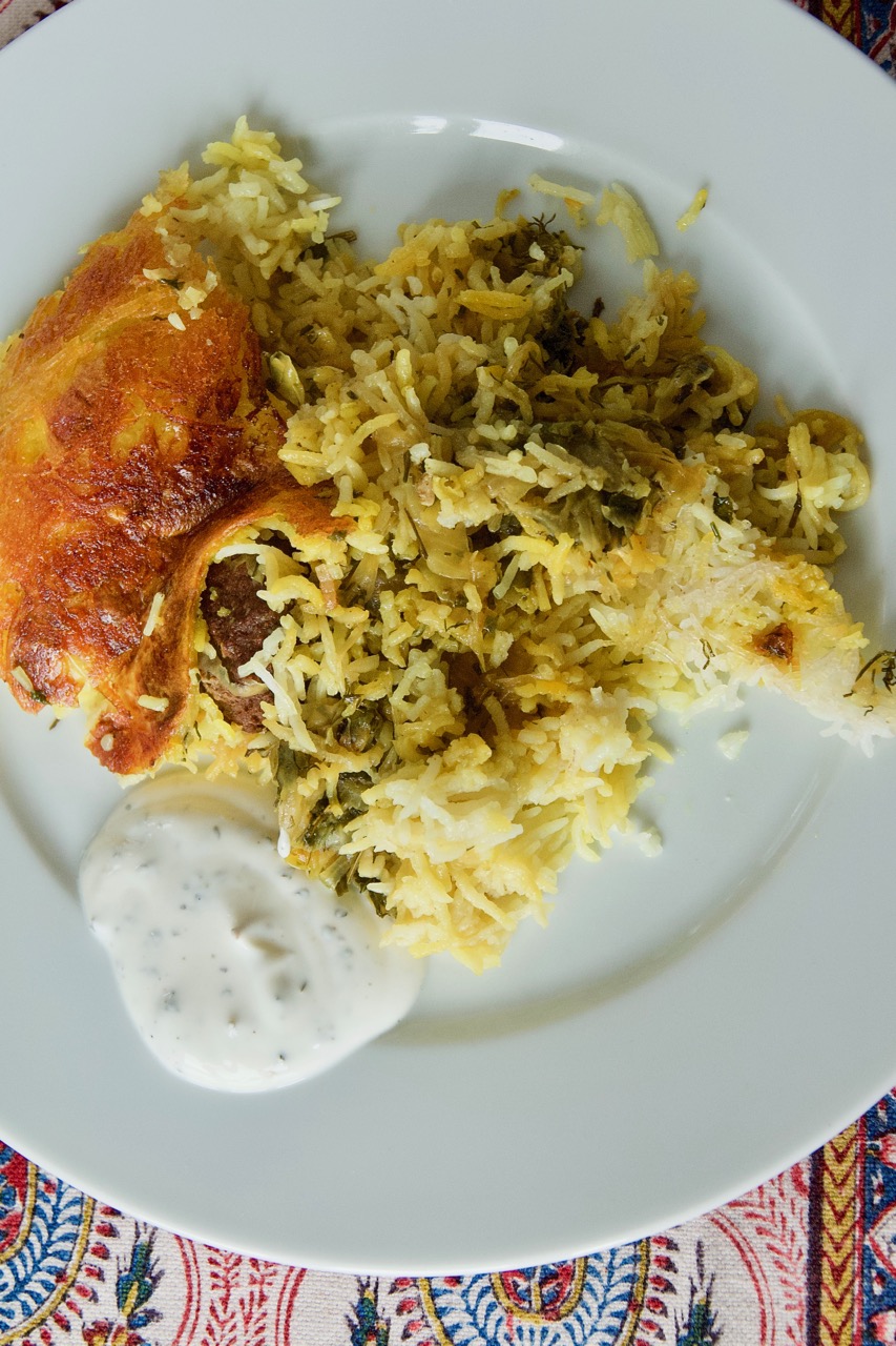 Das hat dann sehr gut geschmeckt, obwohl mir die Kartoffel-Tahdig nicht optimal gelungen ist. Das liegt wahrscheinlich daran, dass ich mich nicht genau an das Rezept gehalten habe. Normalerweise dämpfe ich den Reis direkt nach dem Kochen im selben Topf mit ganz niedriger Hitze. Dann ist er aber vom Kochen noch heiß. Nachdem ich die Mischung im Topf hatte, habe ich das ebenso gemacht und nicht, wie im Rezept empfohlen, erst einmal für ein paar Minuten auf mittlerer Hitze zu kochen. Nach 15-20 Minuten habe ich das bemerkt, aber da dann der Hunger immer größer wurde, habe kurz sehr stark erhitzt, um die Mischung warm zu bekommen und dann auf bei niedriger Temperatur gedämpft. Resultat war, dass sich die Kruste nicht von selbst gelöst hat und ziemlich dunkel war. Ich konnte die Tahdig trotzdem in 3 oder vier großen Stücken ablösen und schön obenauf legen, werde beim nächsten Mal aber besser aufpassen. Vielleicht hatte ich auch mit dem Wasser und dem Öl unten im Topf etwas großzügiger sein sollen.
