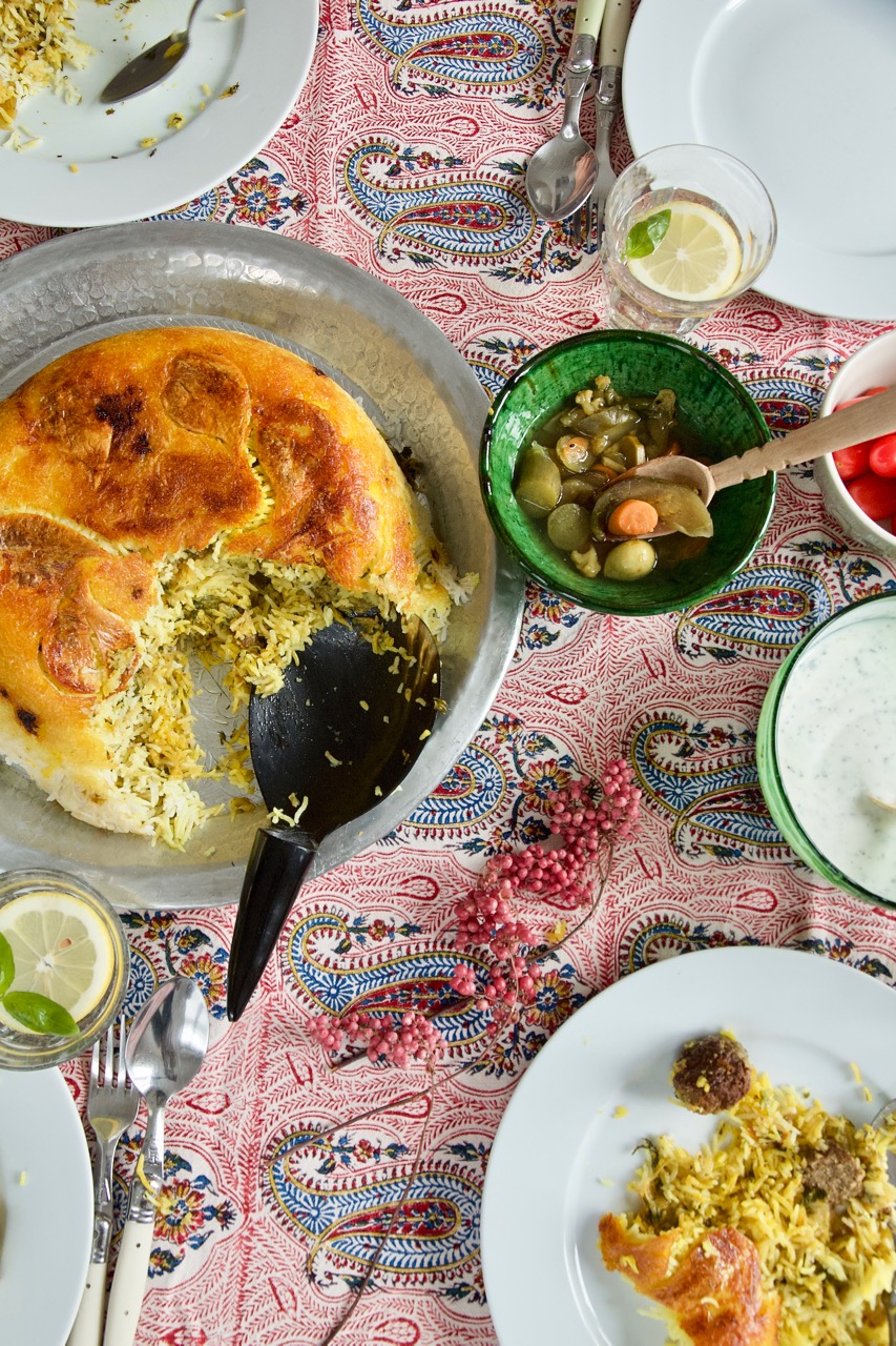 Safran-Reis mit Spitzkohl und Hackbällchen auf die Kartoffelkruste geben und hügelförmig aufschichten. Einige Löcher in den Reishügel bis zum Boden bohre, Deckel in einem sauberen Geschirrtuch einschlagen und fest verschließen. Reis zunächst für 5 Minuten bei mittlere Temperatur kochen, Temperatur auf niedrig stellen und Kalam Polo für 45 – 50 Minuten dämpfen. Sobald der Reis fertig ist, einen großen Teller auf den Topf legen, Topf und Teller mit einem Schwung umdrehen und den Topf vorsichtig abziehen. Fertig ist der Reiskuchen.