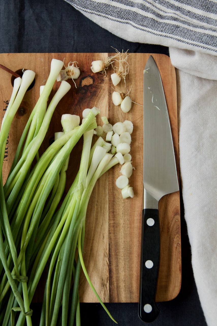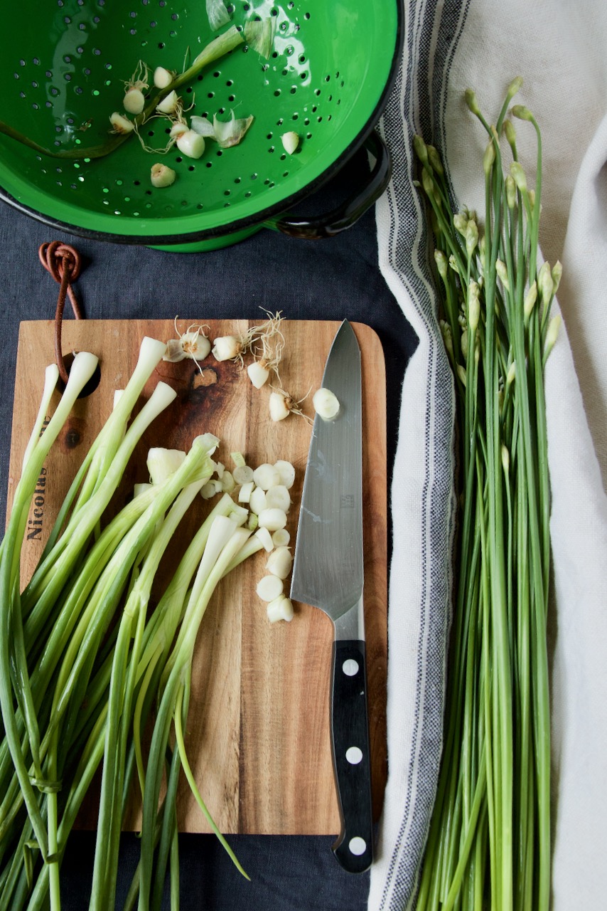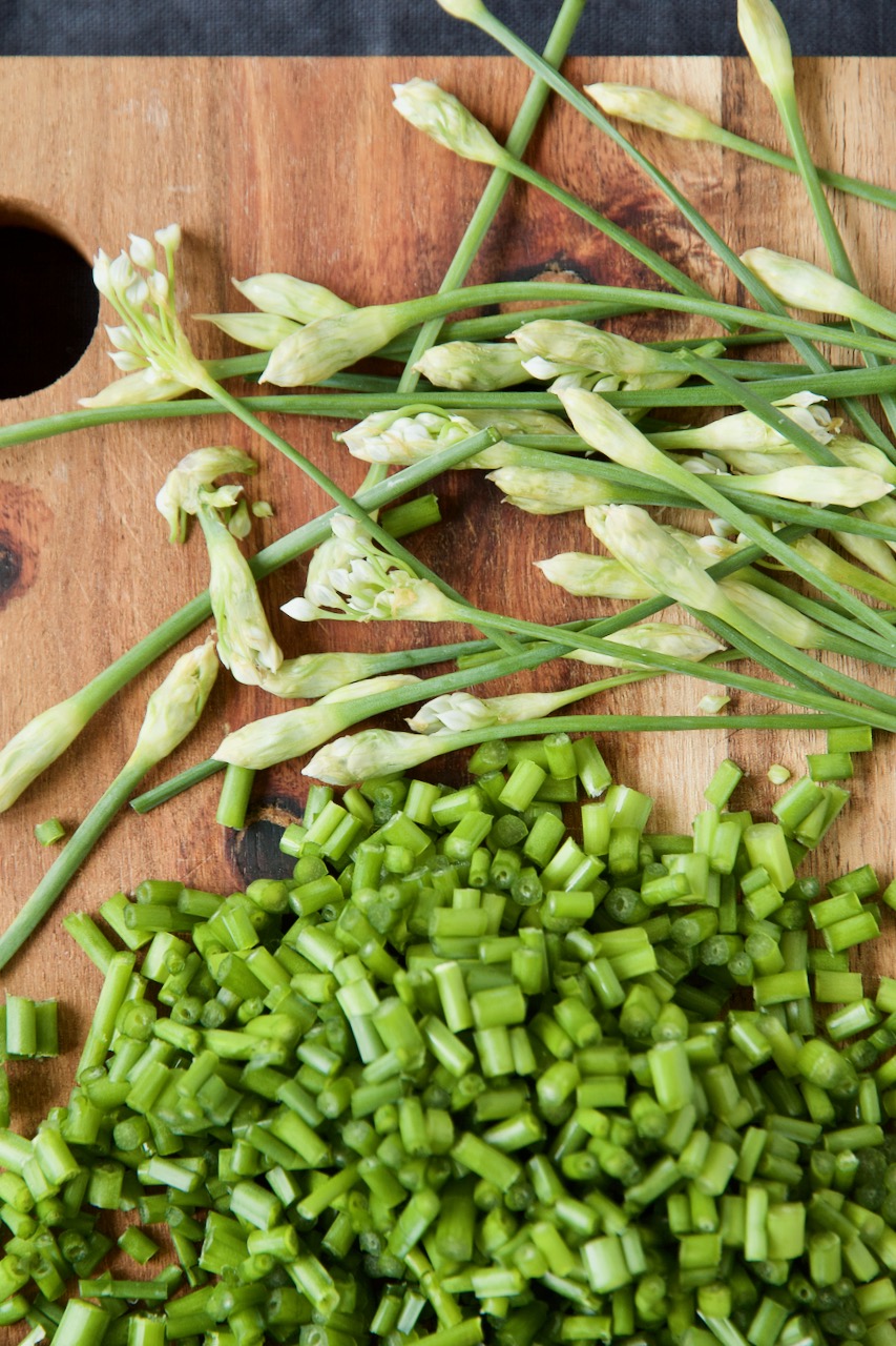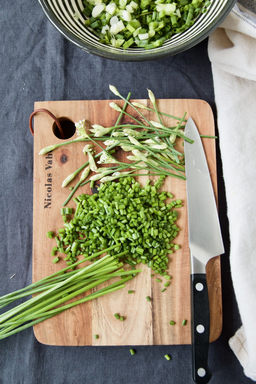 In der Zwischenzeit Schnittknoblauch und Frühlingszwiebeln fein schneiden.