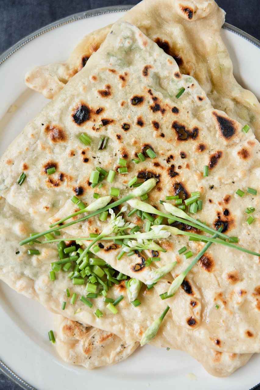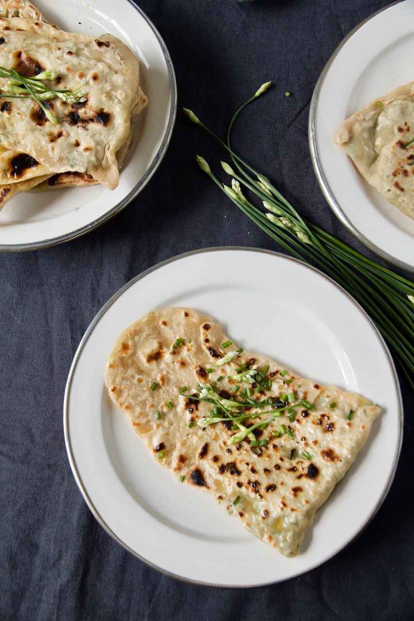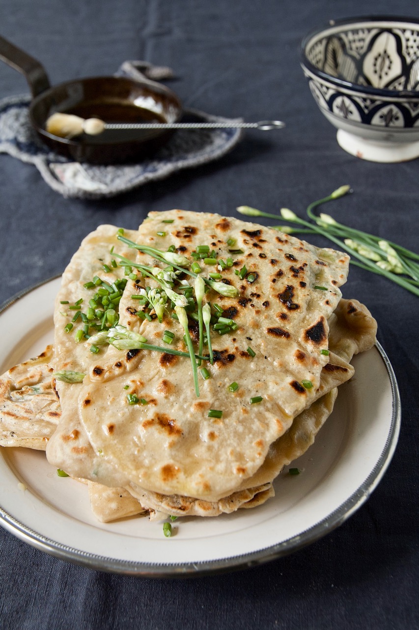 Kelaneh schmeckt auch sehr gut mit Bärlauch, Frühlingszwiebeln, Lauch oder mit Schnittlauch, denn sie sind alle Verwandte. Ich habe Schnittknoblauch (Allium Tuberosum) und chinesische Frühlingszwiebeln aus dem Asialaden verwendet. Es gibt auch Versionen von Kelaneh, die mit Feta oder Lammhackfleisch gefüllt werden. In Pakistan wird es Bolani genannt und mit gebratenem Gemüse, beispielsweise Zwiebeln und Spinat, Kartoffeln oder Kürbis gefüllt. In der Türkei heisst es Gözleme und wird mit rohen Zutaten wie Kräuter, Spinat, Käse oder Lammhackfleisch gefüllt und dann erst gebacken. In China gibt es ein sehr ähnliches Gericht was Cong you Bing oder chinesisches Pancake heisst, das bestelle ich mir gerne, wenn wir chinesisch essen gehen. Probier doch auch mal selbst gebackenes Lavashbrot mit Sabzi Khordan- Kräuterwrap mit Schafskäse.