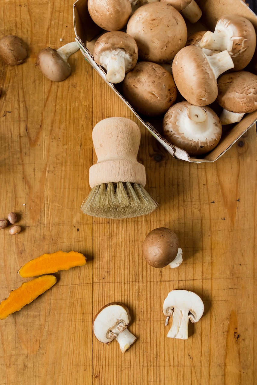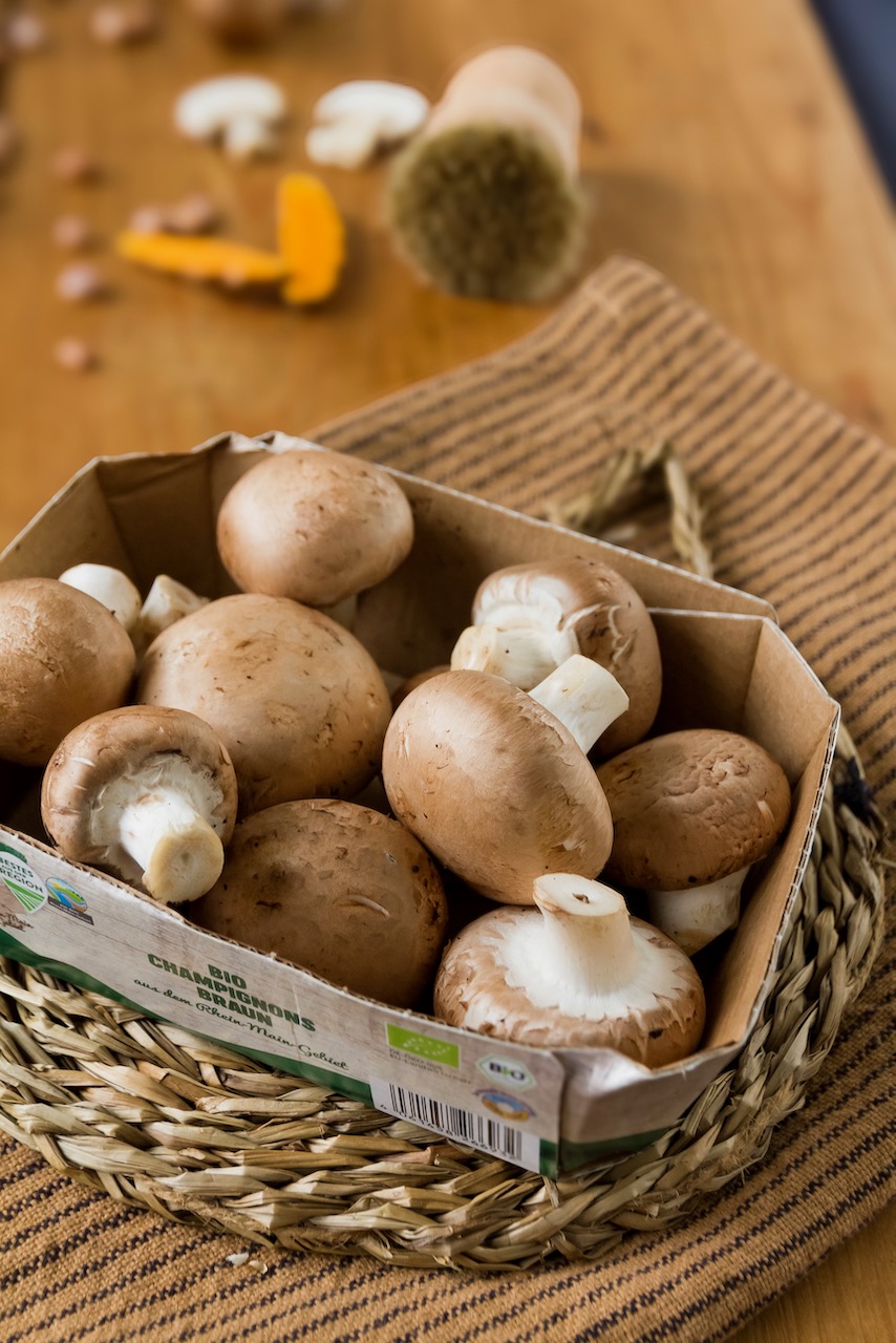 Butter oder für die vegane Alternative Öl oder pflanzlicher Butter in einer anderen Pfanne schmelzen und Champignons zufügen. Solange braten bis sie gar sind.