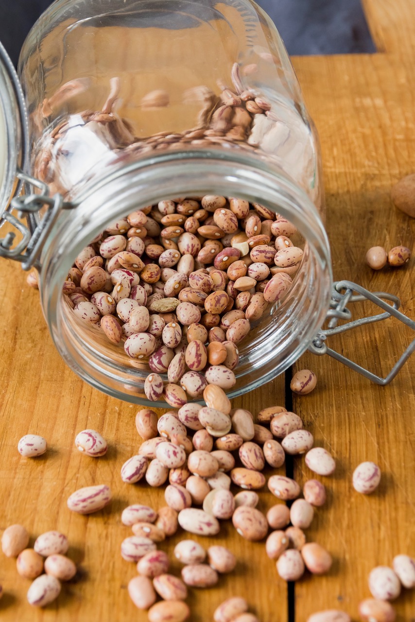 Pinto Bohnen über Nacht einweichen und zwischen durch das Wasser austauschen. Am nächsten Tag in einen Topf geben, mit soviel Wasser auffüllen, dass 2 – 3 Fingerbreit Wasser über den Bohnen steht. Bei mittlere Temperatur für ca. 30 Minuten köcheln. Die Bohnen sollten weich gekocht sein.