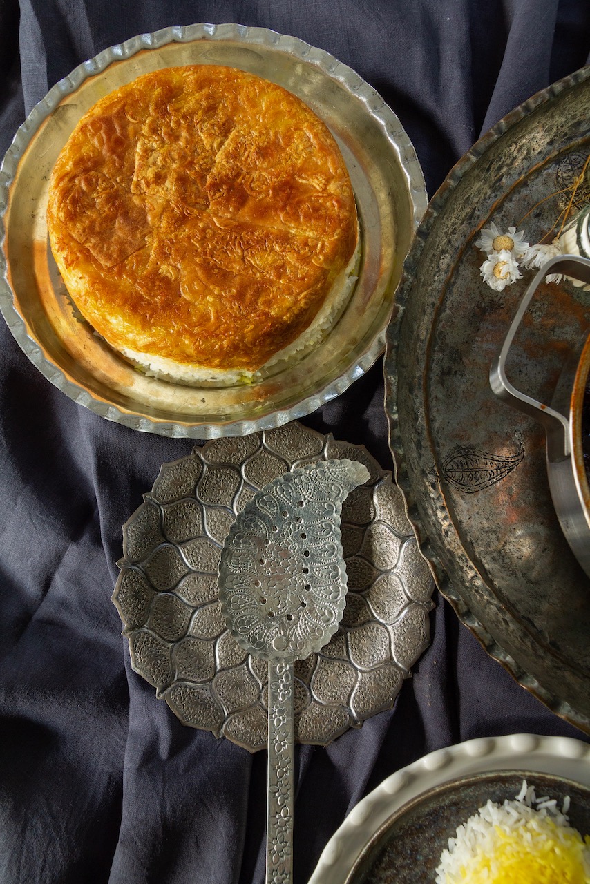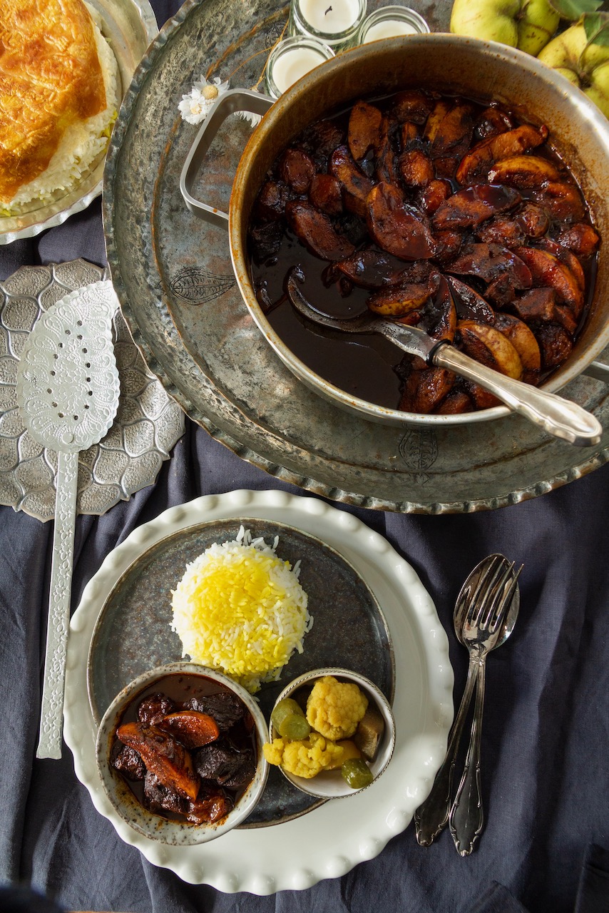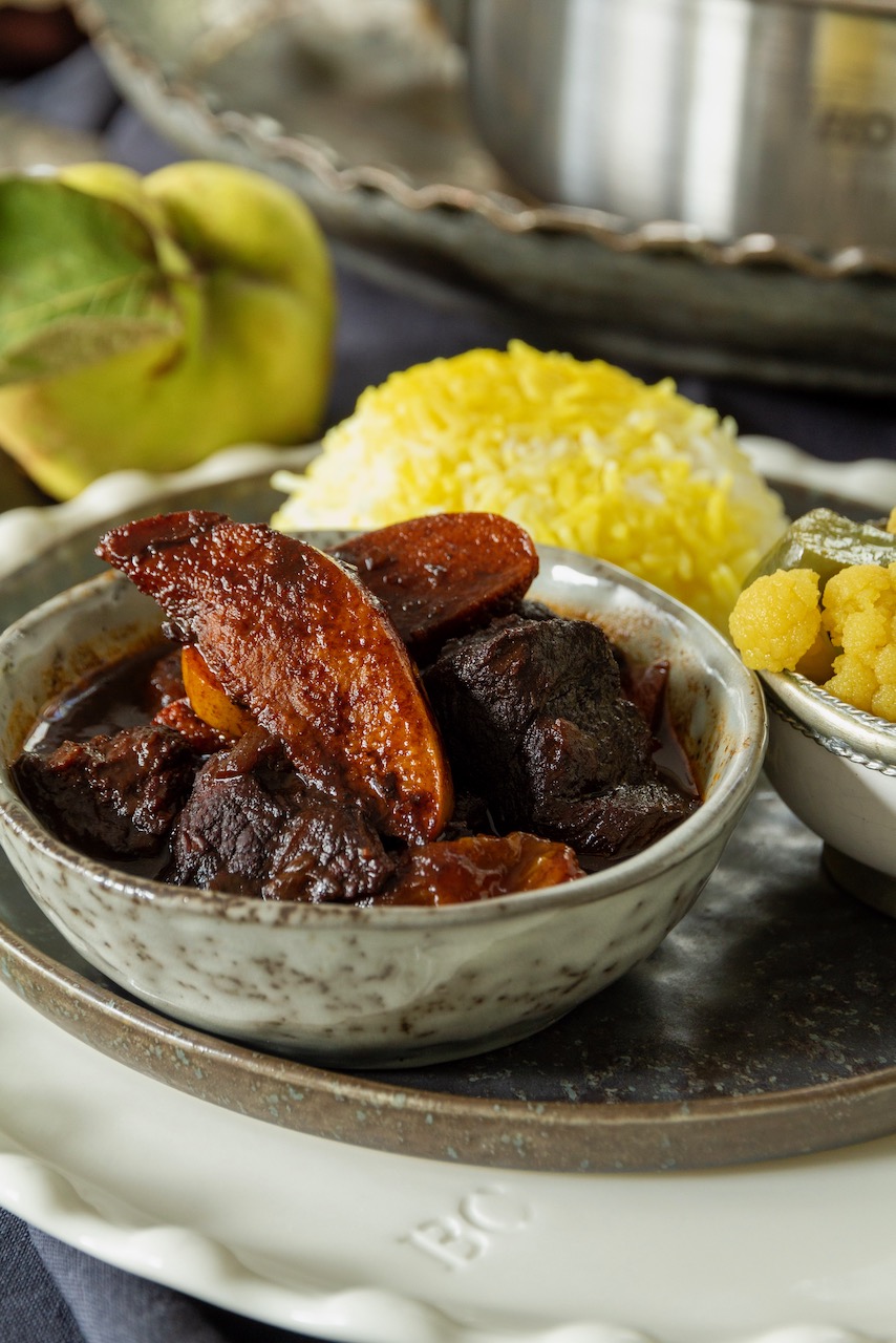 Der Rindfleisch-Quitten-Schmortopf wird traditionell mit persischem Reis und sauer eingelegtem Gemüse (Torshi) serviert.