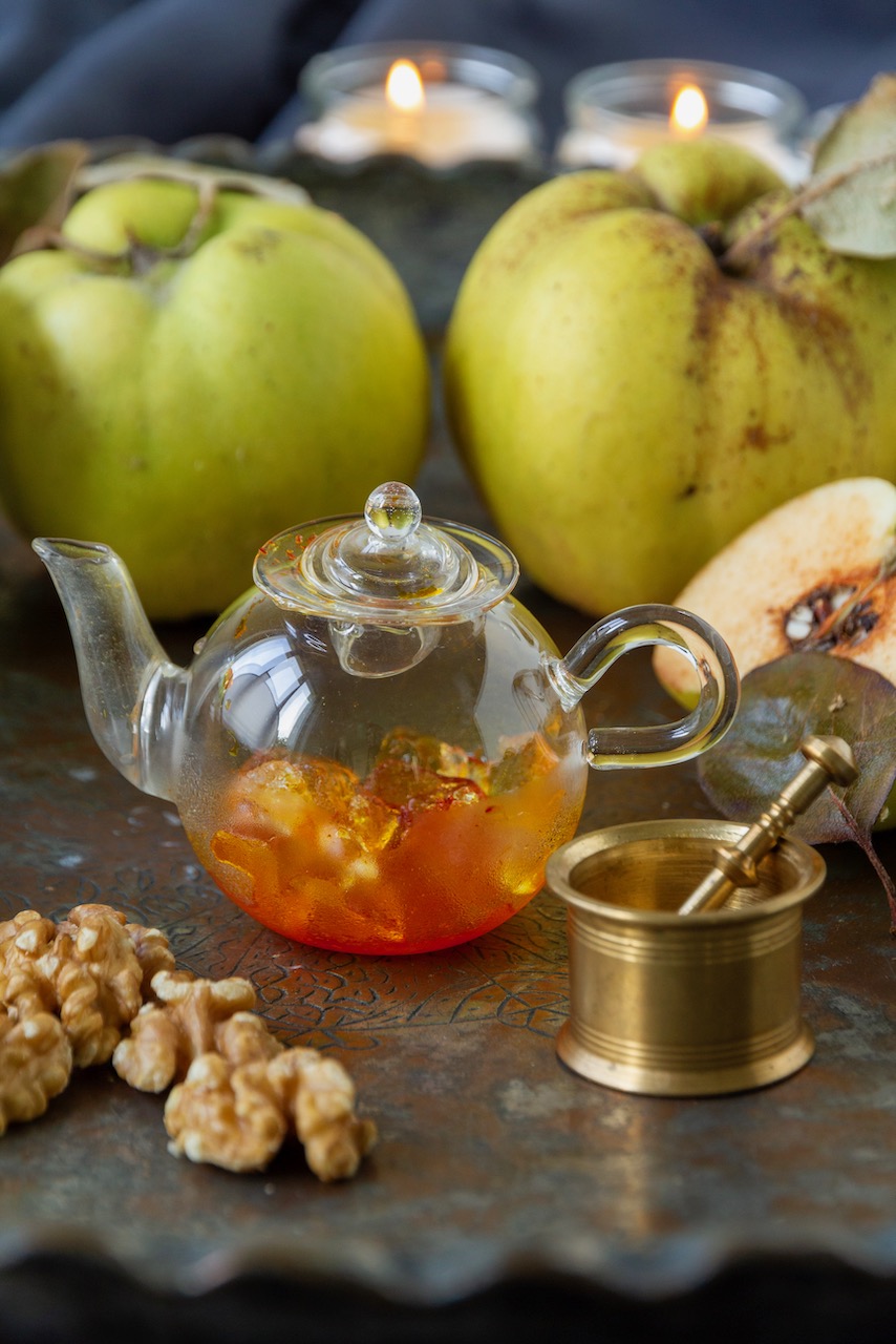 Warum ist die Quitte so beliebt? Ganz einfach: Sie bringt Magie in die Küche! Kaum eine andere Frucht ist so vielseitig und wandelbar wie die Quitte. Sie passt perfekt in herzhafte Gerichte wie mein wohlig-warmes Khoresht-e Beh Aloo, aber ebenso glänzt sie in süßen Verführungen. Aber das ist längst nicht alles. Die Quitte passt wunderbar zu geröstetem Fleisch, harmoniert mit Mandeln und Vanille und wird in Begleitung von Zimt zur puren Herbstmagie. Wenn die Quitte gekocht wird, entfaltet sie ein Aroma, das an duftende Holunderblüten und reife Muskattrauben erinnert – mit einem Hauch von würziger Süße. Kaum eine Frucht kann so nahtlos zwischen herzhaft und süß wechseln wie die Quitte und das macht sie zu einem echten Herbst- und Winterjuwel.